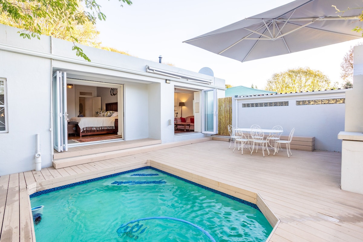 Évadez-vous dans un charmant gîte de style Karoo. Détendez-vous sous les étoiles scintillantes en vous immergeant dans la détente pure dans le jacuzzi extérieur accueillant au feu de bois. Sentez la chaleur réconfortante du feu crépitant en vous blottissant avec un livre captivant au lit, ou laissez les mélodies apaisantes de disques vintage vous emménager dans une époque révolue. Préparez-vous à être enchanté par l'ambiance intemporelle de ce joyau caché, à une courte distance, mais à une courte distance, à l'écart de l'agitation.
