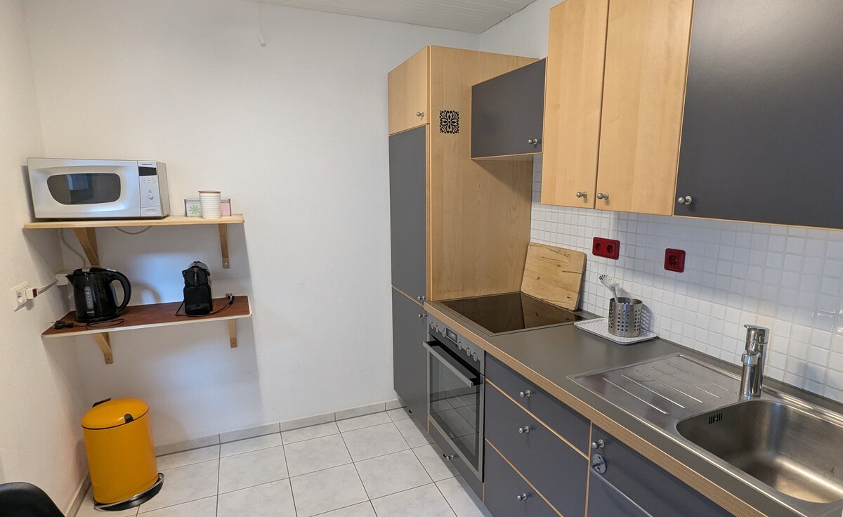 - Spacieux appartement privé de 40 m² avec terrasse et entrée privée - Cuisine entièrement équipée avec lave-vaisselle et grand réfrigérateur/congélateur - Salle de bain avec douche et lave-linge - Salon confortable avec canapé 3 places et deux places - Lit double français (140 cm de large) - À seulement 10-15 minutes à pied de la gare régionale - Arrêt de bus juste à côté de la maison - Possibilité de se garer gratuitement devant la maison - Emplacement idéal pour les excursions vers la Forêt-Noire, Nagold, Tübingen et Stuttgart