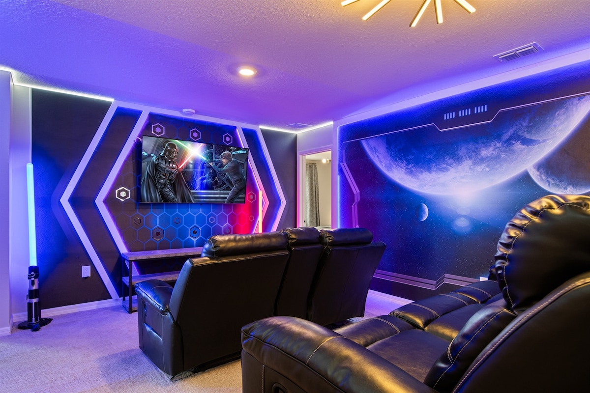 The perfect balance of STYLISH DESIGN, LUXURIOUS COMFORT, & ENDLESS ENTERTAINMENT, beautifully situated with stunning views in the sprawling 3.5 square mile Reunion Resort. You will have your own private pool, spillover spa, STAR WARS cinema-game room with pinball, classic arcade games, and karaoke, MARVEL kids room with tube slide and double bunks, the latest Xbox Series S, a sprawling 2000 ft2 pool deck, fire pit, and even a HARRY POTTER cupboard hidden under the stairs, minutes to Disney.