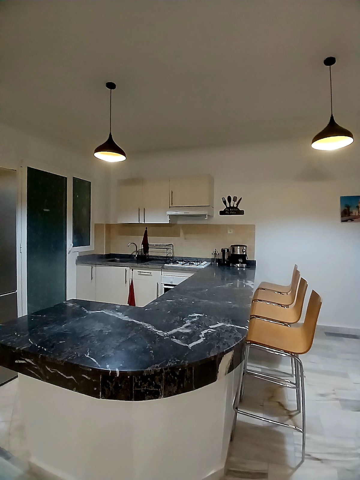 "Charming accommodation in Tangier! Discover a cozy bedroom, an original kitchen, a welcoming living room, and a sunny patio. Enjoy the comfort and style of this unique space." "Charmant hébergement à Tanger, situé en plein cœur de la ville ! Découvrez une chambre douillette, une cuisine originale, un salon accueillant et un patio ensoleillé. Profitez du confort et du style de cet espace unique."