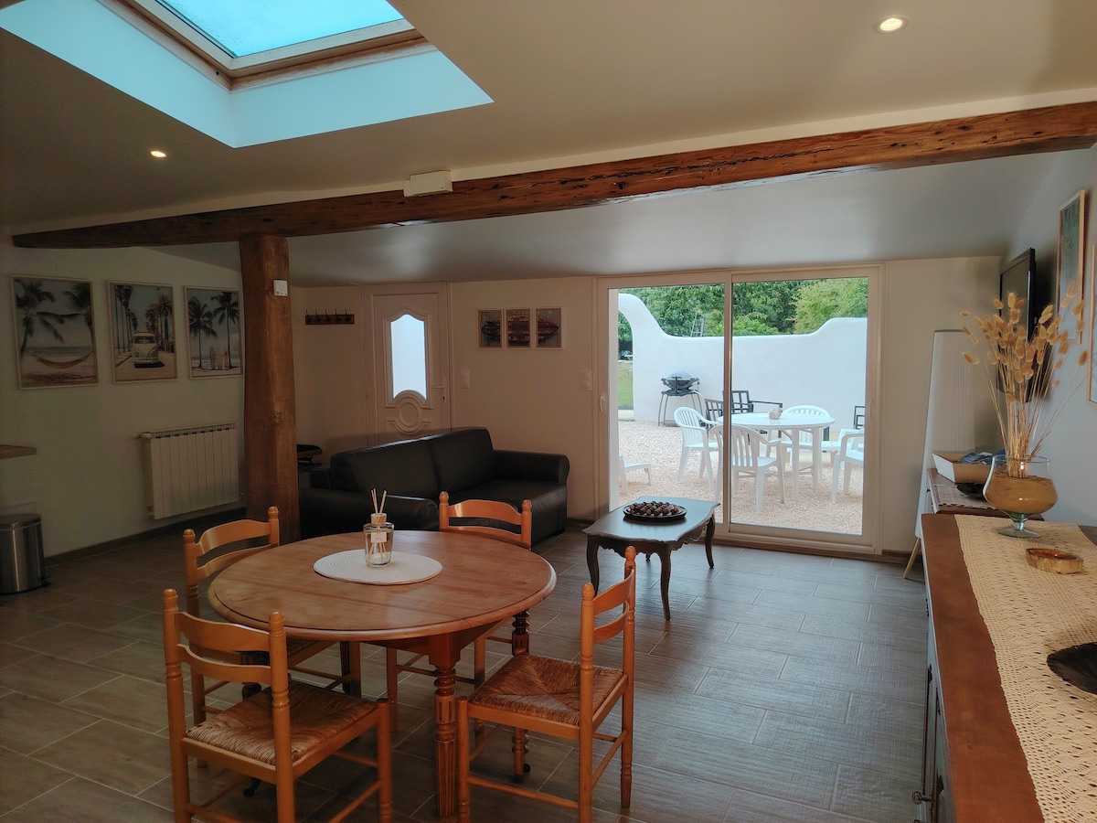 Havre de paix, idéal pour couple avec ou sans enfant avec piscine partagée avec les propriétaires. Bienvenu chez Marie et Laurent pour un sejour dans leur petit paradis au cœur de la route des huîtres Un lieu unique de 50 m2, doté de tout le confort : • Chambre tout confort lit 160 , tv canal+, wifi... . canapé convertible. • Salon/salle à manger ouvert sur l'extérieur avec piscine et terrasse. • Cuisine neuve équipée (induction,lave et sèche linge, etc...) • Parking privé