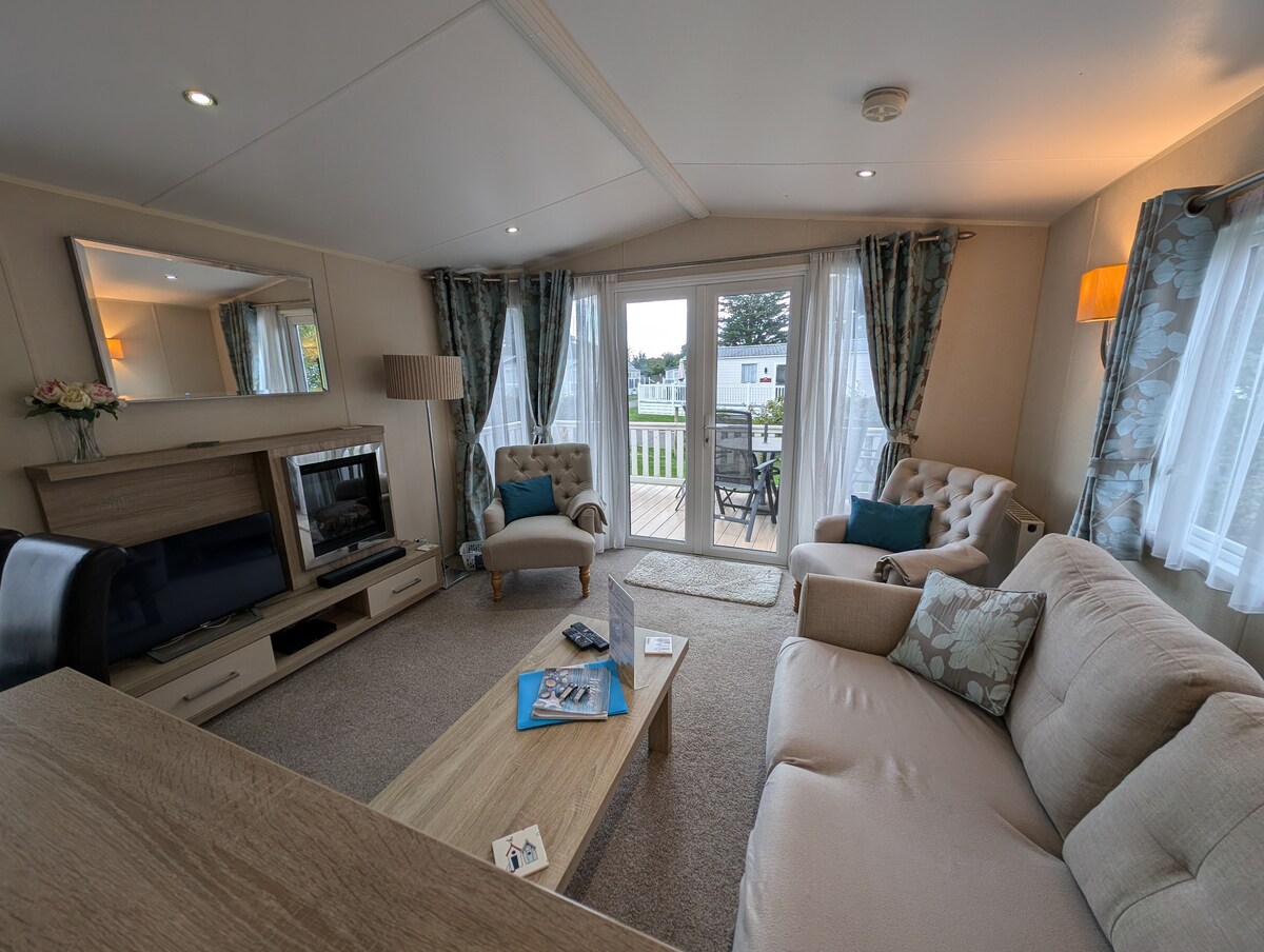Maison de vacances familiale de 2 chambres (6 couchages), chauffage central et double vitrage partout. Située dans un cul-de-sac calme à proximité de toutes les commodités du parc et de la plage adjacente. Le prix comprend le Wi-Fi. Espace de vie ouvert avec grand canapé-lit en forme de L, télévision 43" et cuisine intégrée entièrement équipée. Salle d'eau familiale et une salle de bains attenante à la chambre principale, qui dispose également d'une armoire double équipée, d'une télévision 32" et d'un lit king size. La chambre à deux lits dispose de deux lits simples. Les portes du patio mènent à une véranda panoramique.