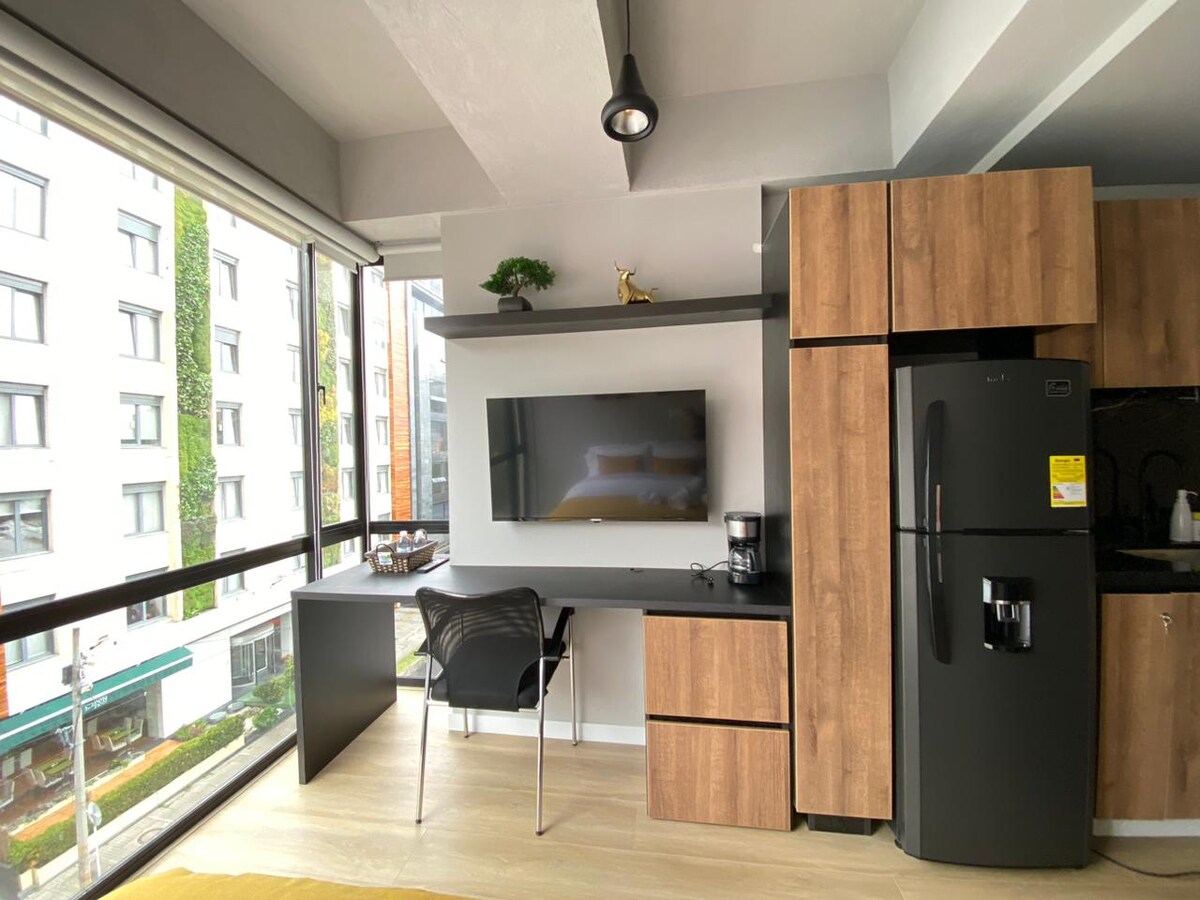 Profitez d'un loft premium au cœur de Chicó Un espace moderne de 27 m² avec balcon privé, lit de luxe, draps extra doux, rideaux motorisés, miroir avec Bluetooth et lumières LED de dernière technologie. Idéal pour les longs séjours : il dispose d'un bureau ergonomique, d'une connexion Wi-Fi 5G et d'une télévision intelligente avec Netflix, Disney+ et Prime Video. Comprend une machine à laver propre et une option de nettoyage hebdomadaire avec changement de linge. Vivez Bogotá avec style et confort.