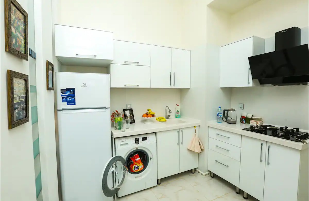 Ce magnifique studio récemment rénové est situé au cœur de la ville et se trouve à une courte distance à pied des principaux sites touristiques tels que la rue Targovy ou Nizami (2 min), le boulevard de bord de mer (2 min), la vieille ville, etc. ainsi qu'un accès très facile aux transports en commun (2 min à pied de la station de métro Sahil). L'appartement est idéal pour les couples et dispose de tous les équipements pour rendre votre séjour sûr et confortable avec une cuisine équipée, un lave-linge, des articles de toilette, la climatisation, des draps et serviettes propres, un lit double, un ascenseur.