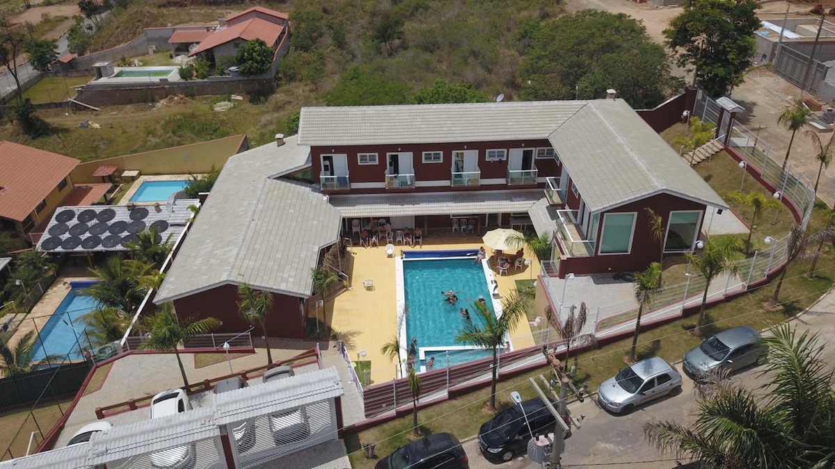 Trouver un endroit calme pour se reposer à Atibaia ne doit pas être une tâche difficile. Vous profiterez du climat tropical avec des suites, qui disposent d'une télévision à écran plat et de la climatisation. De plus, nous disposons d'une connexion Wi-Fi gratuite, d'une piscine chauffée, d'une salle de jeux, d'équipements de gymnastique, d'un espace gourmet, d'un terrain multisports et d'un parking. * Pour vous enregistrer, vous devez envoyer 72 heures à l'avance la liste avec le nom complet, la carte d'identité et les données du véhicule de tous les clients.