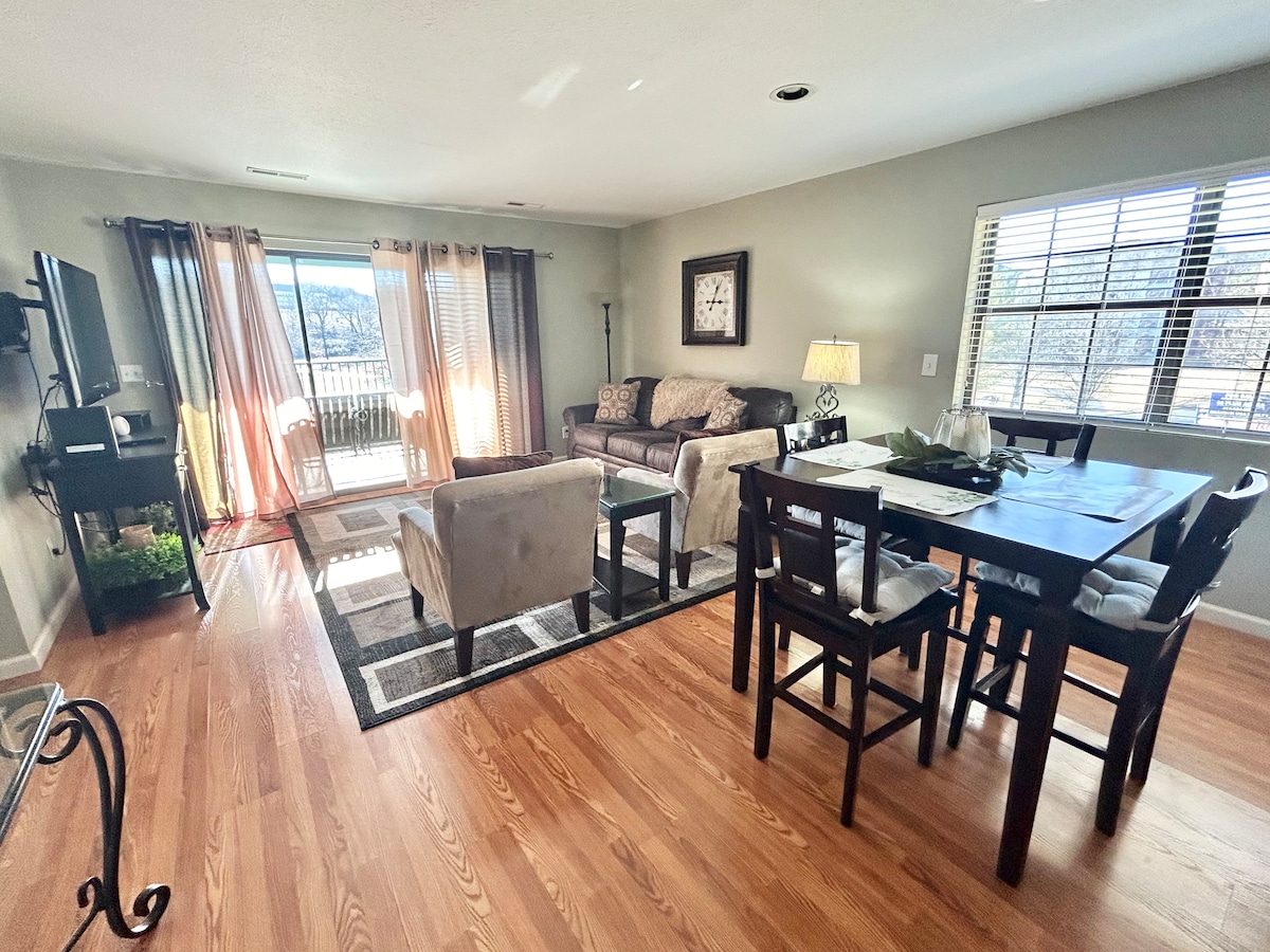 Peaceful, centrally located newly renovated walk-in 1 bedroom Condo ideal for couples or small families. This beautiful getaway includes new flooring, a kitchen, a queen size sleeper sofa, a heavenly reclining chair to unwind while watching the big screen TV. Enjoy a great night's sleep in a luxurious king size bed. Located just minutes from the Entertainment District, fabulous dining and shopping options, Lake Taneycomo Marina and hiking, fishing, boating and swimming at Table Rock Lake.