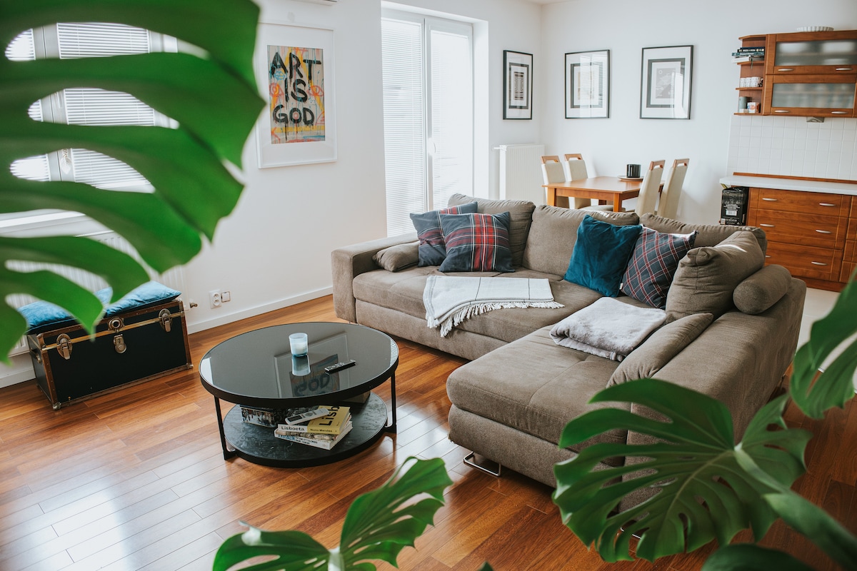 Modern 2-bedroom apartment with living room & balcony. Sleeps up to 5 guests with queen bed, sofa bed for 2, plus additional airbed. Recently renovated with high-speed WiFi, dishwasher, washing machine, separate shower & bathtub, iron, ironing board. Fully equipped kitchen with dining area. Located just 7 minutes by car to main train station, 17 minutes via public transport, and only 5 minutes' walk to Forest Park. Situated in a safe neighborhood —perfect for both business and leisure stays.