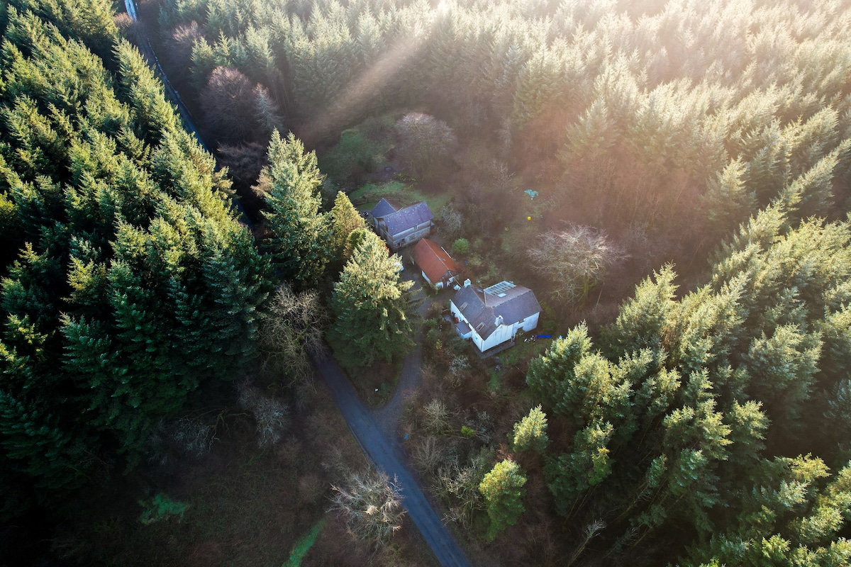 Un chalet/ annexe vieux de 200 ans avec des plafonds voûtés et des poutres apparentes. Grand séjour ouvert avec grand poêle à bois. Cuisine entièrement équipée avec micro-ondes et lave-vaisselle. Une chambre avec une grande armoire et une salle d'eau attenante, un grand jacuzzi situé à l'extérieur à environ 30 pieds de la porte du chalet. Au bord des Brecon Beacons, entouré de terres agricoles, situé dans deux acres et demi de forêt privée. Arrivée paisible et tranquille entre 15 h et 22 h