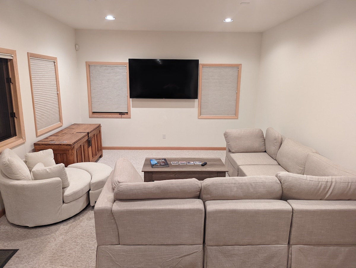 Cliquez sur « Afficher plus » pour en savoir plus sur notre offre spéciale de Noël ! - 3 étages, 2 662 pieds carrés au total - Garage privé pour 2 voitures (1 grand véhicule + rangement eq) - Chargeur pour véhicules électriques - Terrasse panoramique avec vue à 180 degrés. - À 1,7 miles du télésiège QuickSilver/du centre-ville - Quartier paisible - De grands espaces communs ouverts, parfaits pour se divertir ! - Sauna privé et jacuzzi - Foyer à gaz extérieur - Café/chocolat chaud entièrement approvisionné - Espace divertissement avec carte/table de billard, baby-foot, espace cinéma - Cuisine du chef