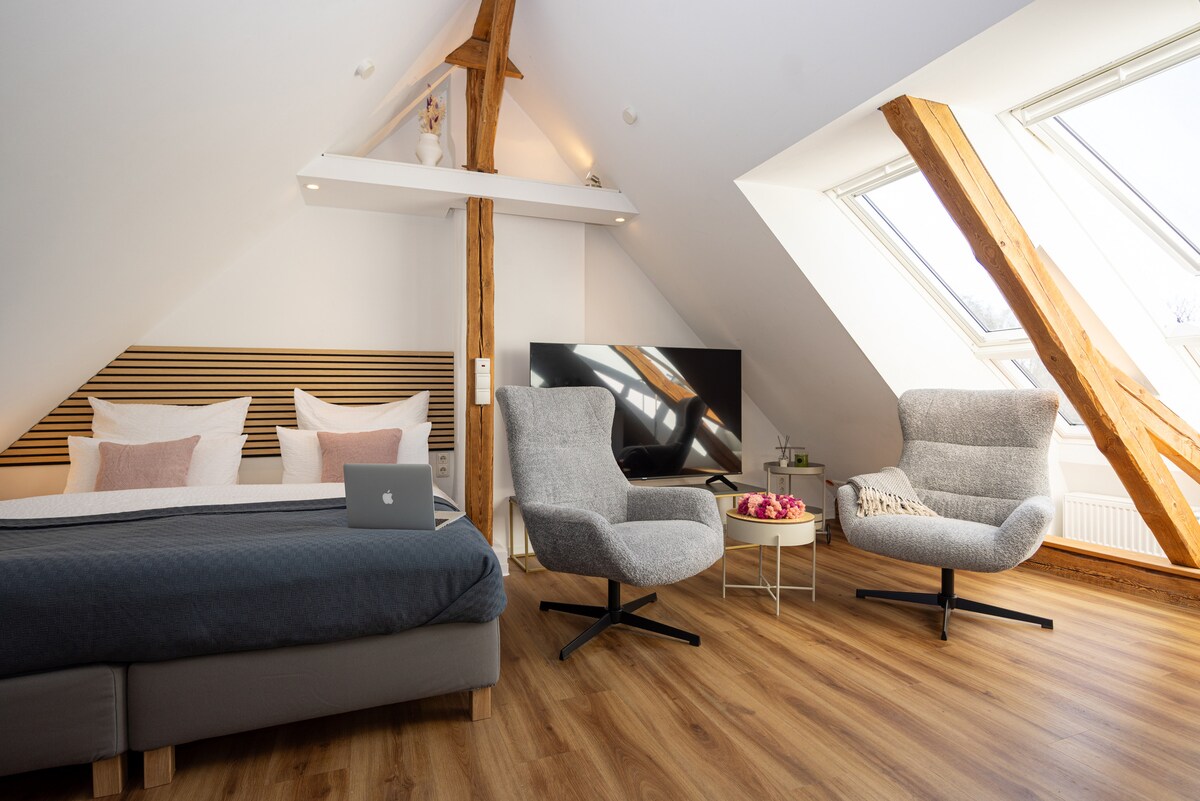 ☆ BIENVENUS À AHRENSBURG ☆ L'appartement récemment rénové est parfait pour 1-2 personnes. Appartement mansardé lumineux moderne et confortable. → Métro vers Hambourg à 5 minutes → Centre-ville à 900 m Arrivée → 24 h/24 → immense télévision intelligente de 65 pouces avec barre de son Lit king size de → 180 cm x 200 cm → Cuisine avec congélateur, cuisinière, four, micro-ondes → Machine à café → Différents types de thé → Waipu TV : télévision par câble et plus de 40 000 films et séries à la demande → WLAN haut débit de 500 Mbit → Places de stationnement sur la rue