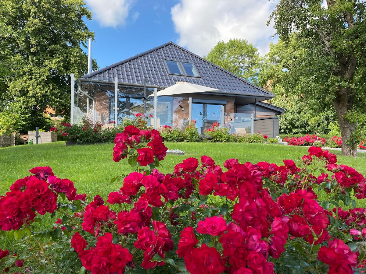 Notre maison de vacances à la campagne, nouvellement équipée en juin 2023, vous offre beaucoup d'espace dans un design élégant. Détendez-vous dans le sauna, cuisinez ensemble dans la cuisine de haute qualité et profitez de la vue magnifique sur la verdure depuis presque toutes les pièces. Dans le studio, vous pouvez faire du sport ou simplement vous détendre. Sur 250 m², vous trouverez tout ce que votre cœur de vacancier désire - sentez-vous comme chez vous.