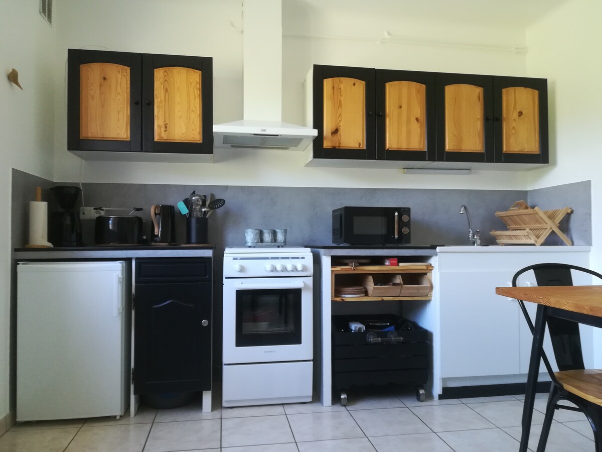 Appartement de 40 m2 au réz-de-chaussée d'une maison, entrée indépendante. Refait à neuf (literie, appareils électroménagers, télé...). Wifi gratuite. Idéalement situé au calme à 1000 mètres d'altitude. Vente de produits fermiers à proximité. Compris dans la location; linge de lit, serviettes de toilette, produits ménagers, huile, vinaigre... Accès BBQ possible. Place de parking. Petit coin extérieur avec hamac, fauteuil, table basse à l'ombre d'un cerisier. Volets (chambre et cuisine).