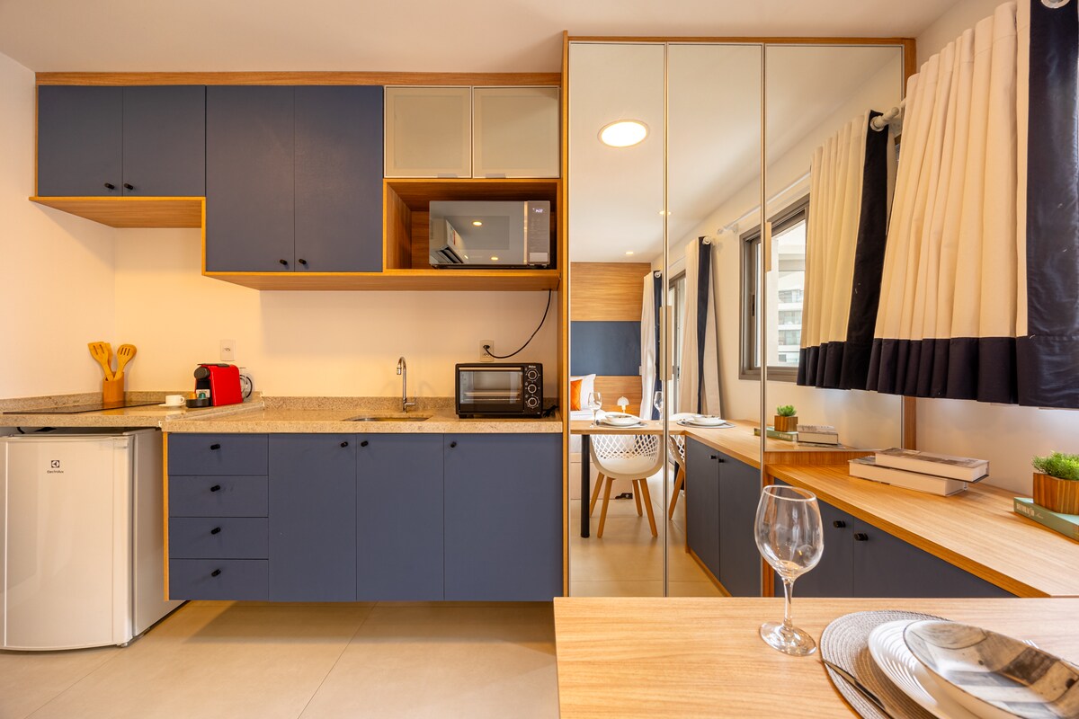 Studio moderno e equipado, com 25m², possui ambiente integrado com a cozinha e 1 banheiro, com vista e fechamento de vidro. Este apartamento tem todo o conforto que você precisa, para ter uma hospedagem agradável em São Paulo. O prédio conta com Quadra de Beach tênis, coworking e academia, além de máquinas de lavar roupa (com custo adicional), em área comum do prédio. Venha se hospedar no coração do Jardins, com bons restaurantes e lojas, a poucos passos da rua Oscar Freire!