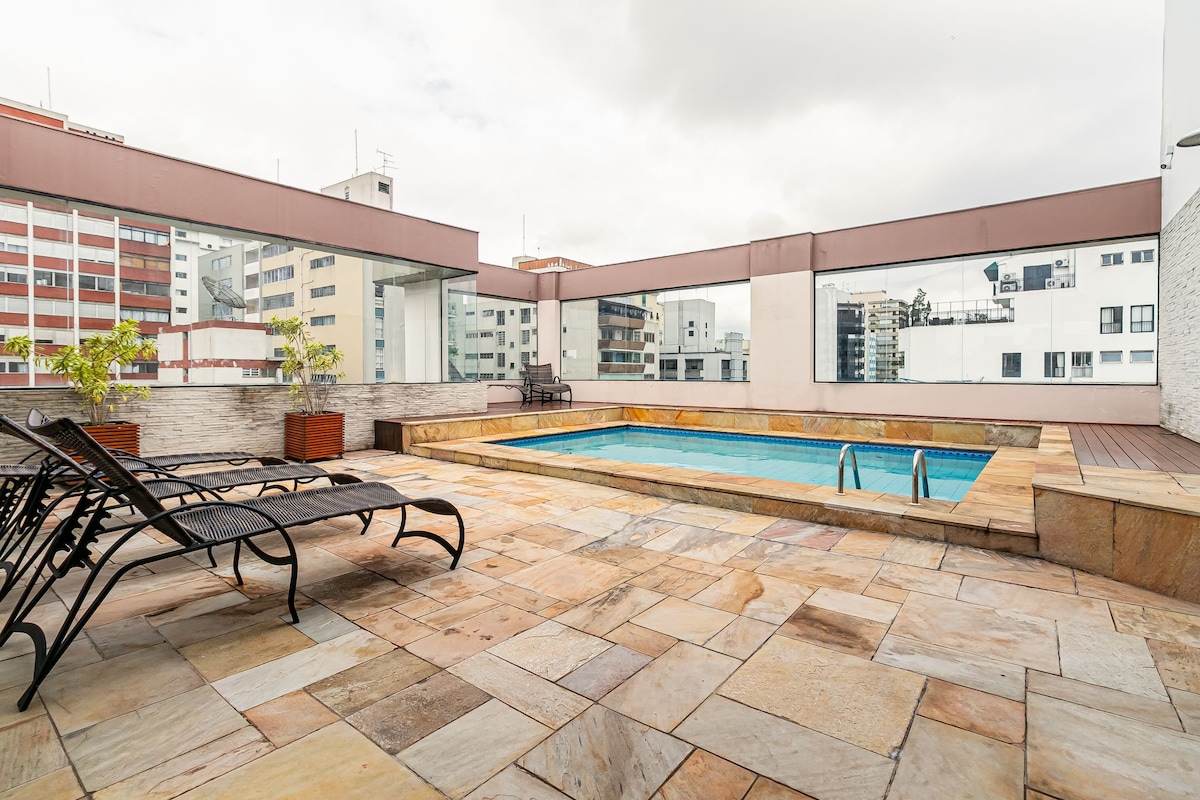 Au cœur de São Paulo, ce charmant toit qui se trouve au 18e étage et occupe tout le sommet du bâtiment offre une vue panoramique incroyable, ainsi qu'un espace privé parfait pour se détendre. Il y a 2 suites confortables, un salon avec canapé convertible, une cuisine équipée, un concierge 24 h/24 et un garage pour votre commodité. Une escapade urbaine conçue pour ceux qui recherchent confort, intimité et style. Les fêtes ne sont pas autorisées.