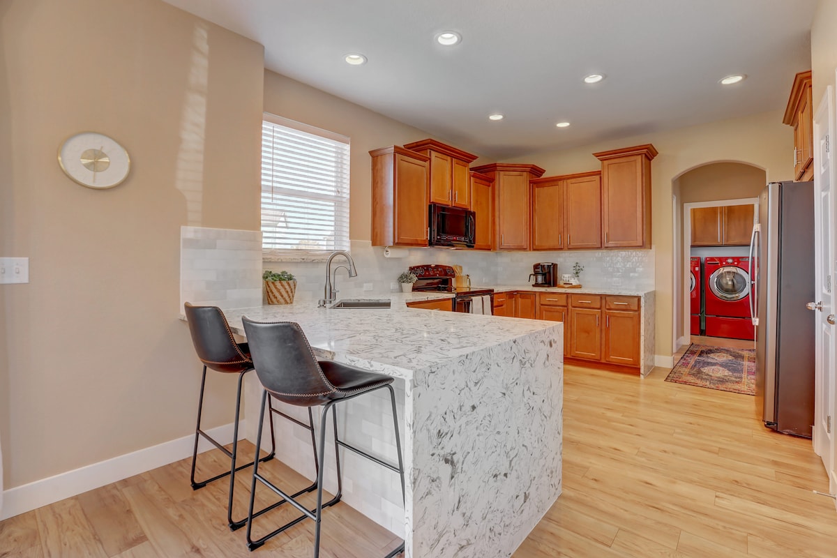 Profitez en famille de cette maison neuve qui offre de bons moments en perspective. Idéalement située entre l'aéroport international de Denver et le centre-ville de Denver, cette maison de 3 chambres et 2,5 salles de bain offre tout ce dont vous avez besoin pour que votre séjour à Denver soit parfait et confortable, y compris une chambre principale au rez-de-chaussée. Le bureau séparé dispose de deux écrans et d'une station d'accueil pour un branchement facile des ordinateurs portables. Vous cherchez à faire une séance d'entraînement rapide ? Profitez du vélo Peloton dans la maison ou faites une promenade rapide jusqu'au centre de fitness à seulement deux pâtés de maisons.