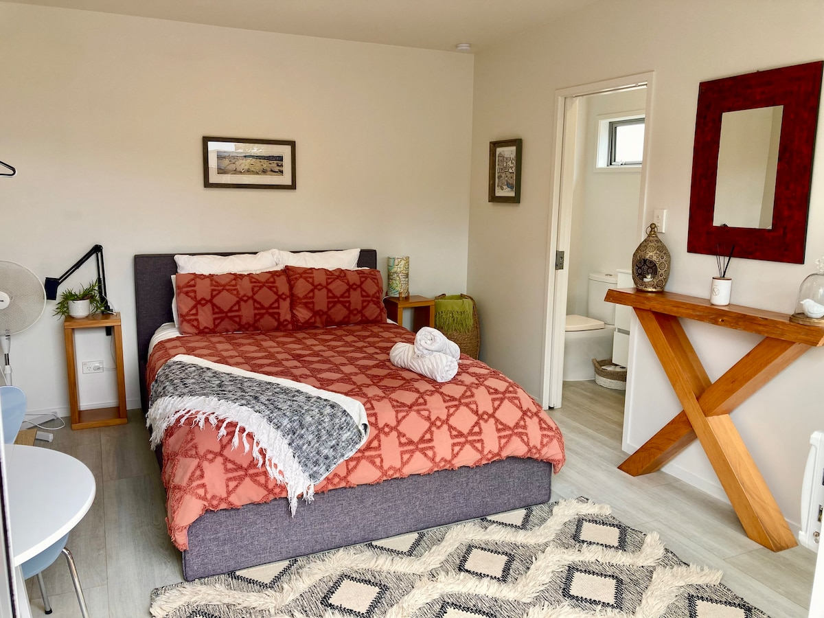 Que ce soit pour quelques jours, une pause relaxante ou de passage, notre studio villa moderne offre tout le confort d'un chez-soi. - Notre studio confortable dispose d'un lit confortable avec des draps propres, des serviettes et une connexion Wi-Fi. - Un petit-déjeuner continental gratuit est inclus dans votre séjour. - Situé dans un jardin privé, avec un parking hors de la rue. - Une retraite paisible où vous pourrez vous détendre et vous relaxer. - À moins de 1 km de l'autoroute d'État 3 et à 16 km du quartier d'affaires de New Plymouth.