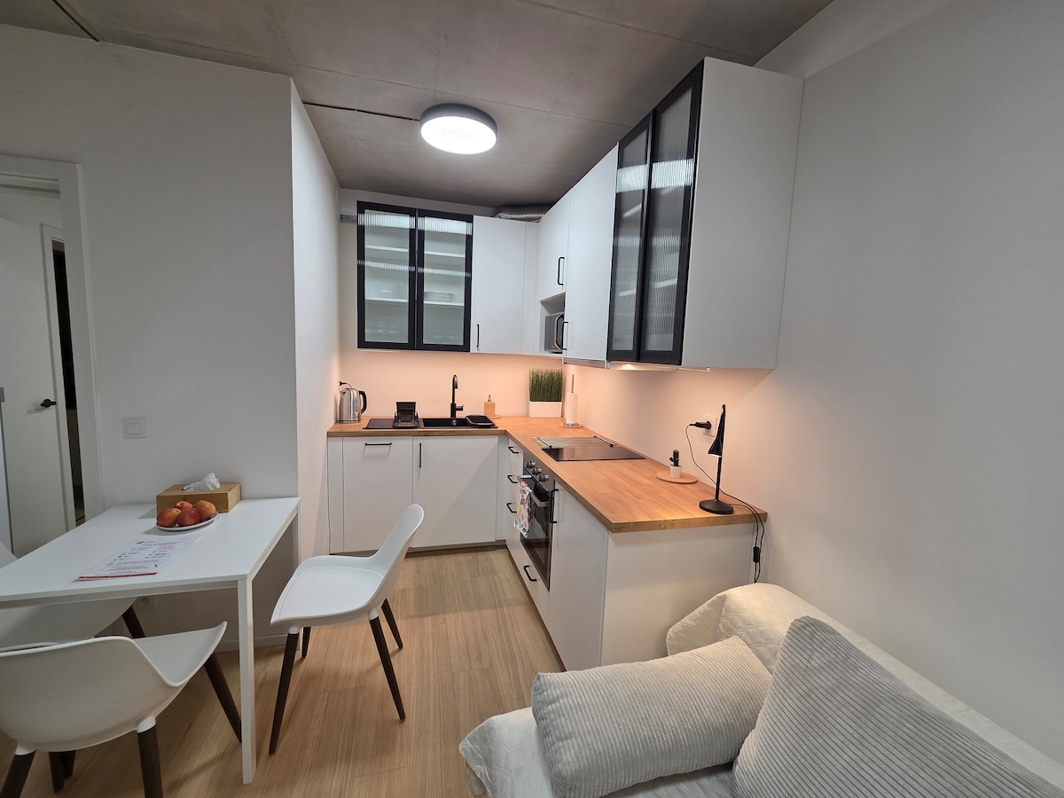 Modern city studio in a brand-new residential project, featuring a comfortable double bed for two guests. The studio includes a equipped kitchenette, a Nespresso coffee machine with starter capsules, tea. Guests can enjoy Netflix on the TV and use a personal safe for valuables. The private bathroom offers a walk-in shower, fresh towels and basic toiletries provided for the stay. Quiet urban location with excellent tram access to Brno city center, ideal for business travelers and couples.