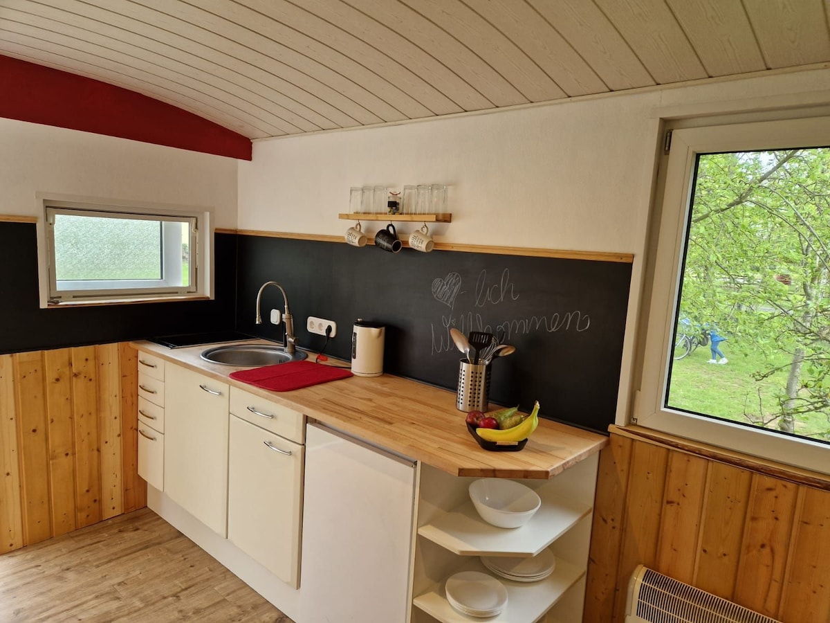Notre ancienne remorque à foin, qui a été transformée en une petite maison mignonne avec une grande attention portée aux détails, se trouve dans notre jardin très proche de la nature ! Une grande véranda invite à prendre le soleil ! La maison a une petite cuisine et dispose de 2 lits pour 2 personnes chacun. Le soir et par temps frais, un poêle à bois procure une chaleur douillette. Ceux qui le souhaitent peuvent participer à l'alimentation des animaux qui vivent chez nous ou faire preuve de créativité dans notre poterie !