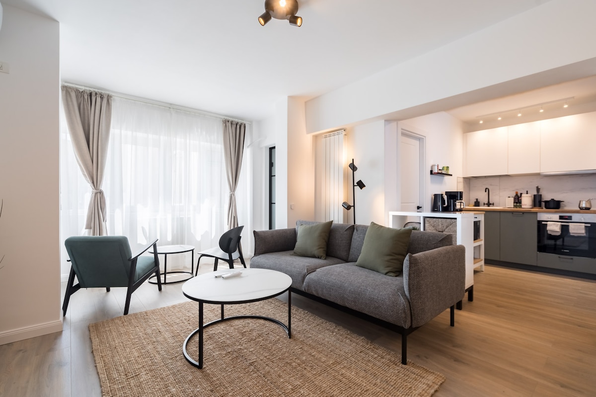 Ce bel appartement d'une chambre est situé au cœur de Bucarest, à la frontière entre la ville animée et la vieille ville. En termes d'emplacement, on ne peut pas faire mieux. Depuis le charmant balcon, vous avez une vue imprenable sur le fleuve et la ville. Le logement est facilement accessible en transports en commun (bus et métro). Cet appartement lumineux a été entièrement rénové en 2023 avec des matériaux de haute qualité et dispose de tous les équipements possibles pour un séjour parfait.