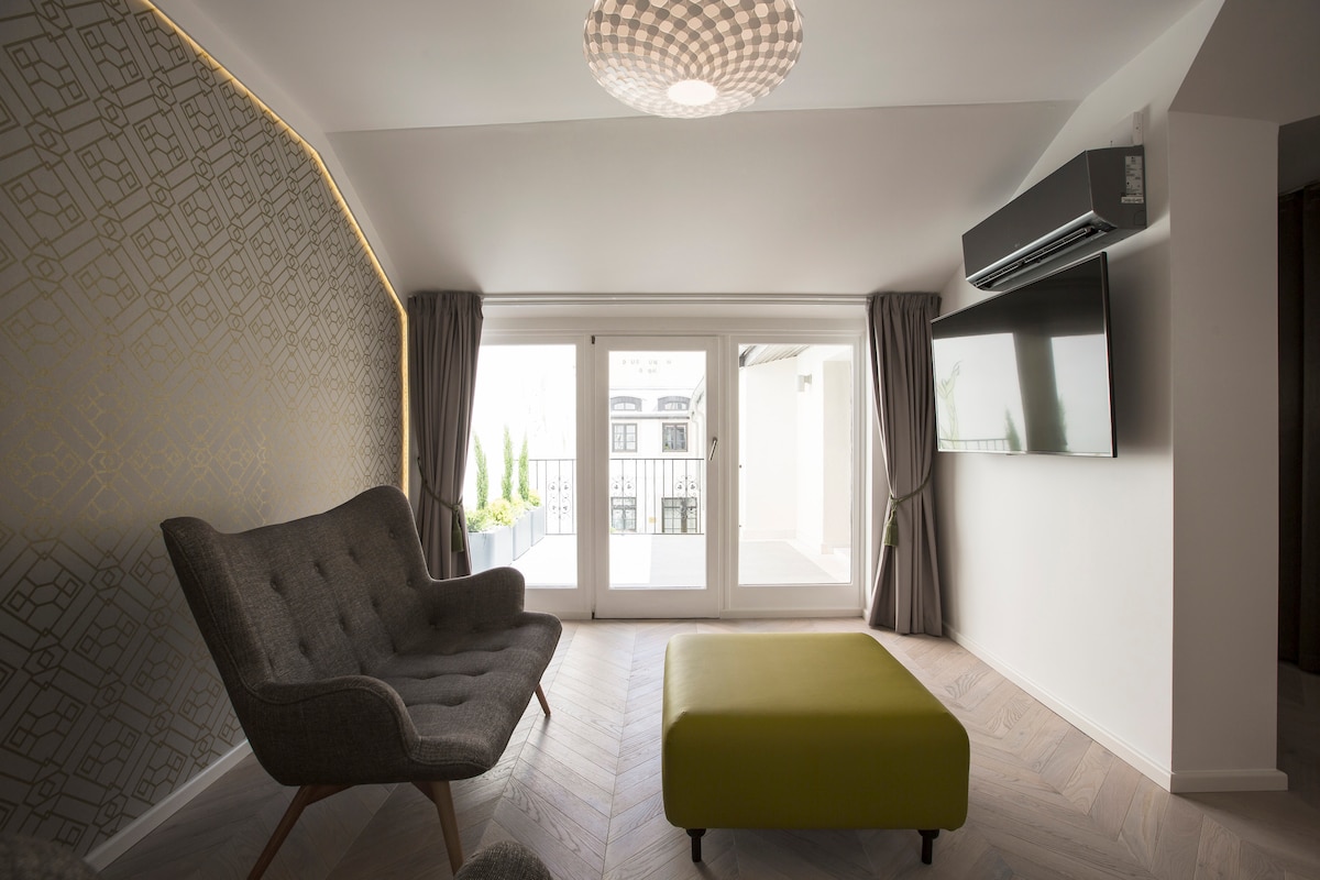 Chambre toute neuve et magnifiquement conçue au cœur de la ville avec climatisation, réfrigérateur, bagagerie, équipements pour bébé. Tout est à distance de marche : restaurants/bars, attractions, sites célèbres, épiceries (basilique, Budapest Eye, Danube, rue de la mode.) Vous pourrez profiter des meilleures vacances de Budapest. Le service de ménage quotidien est inclus !