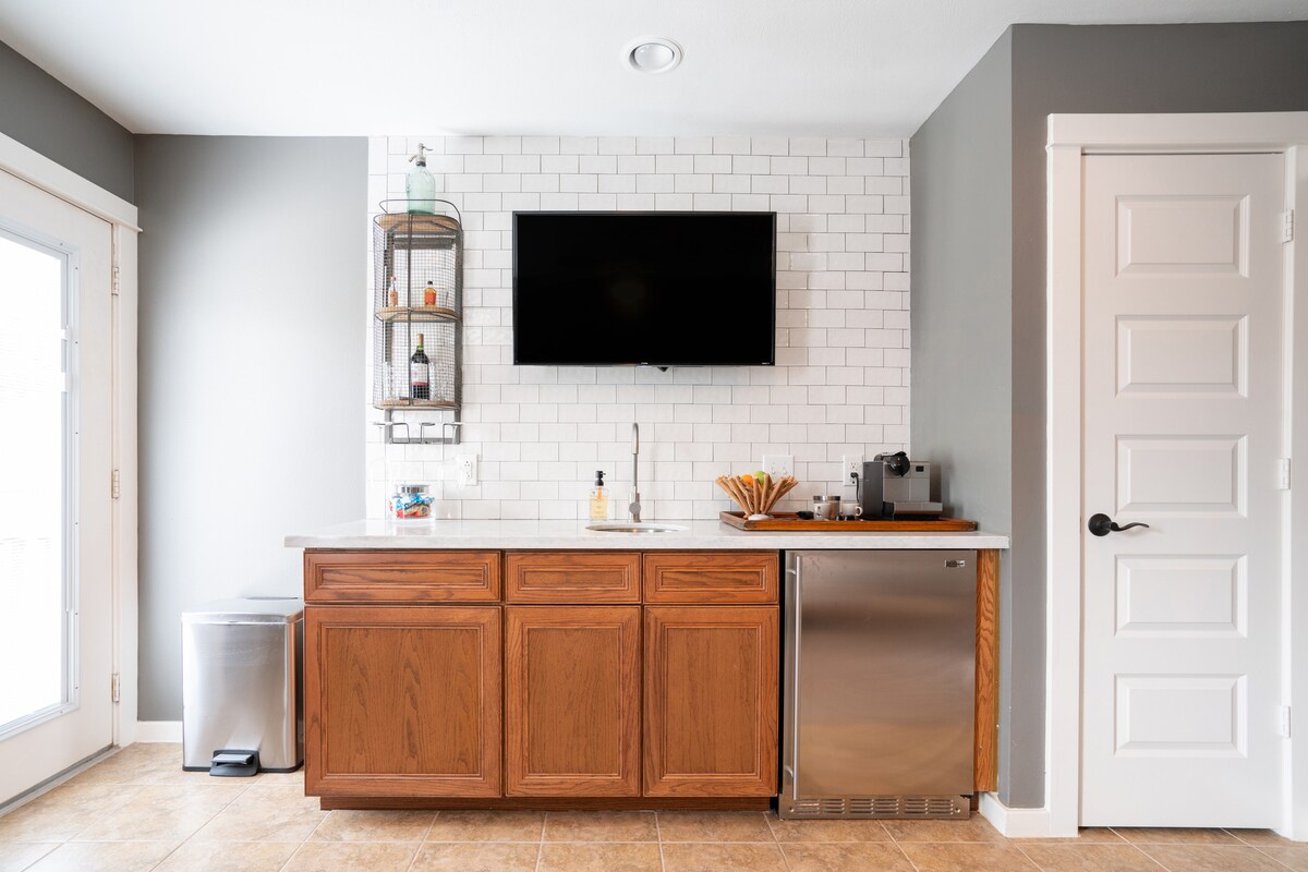 Lit Queen Size, lave-linge et sèche-linge, mini-kitchenette, douche ouverte, grande baignoire, poste de travail informatique et télévision connectée à écran plat de 65 pouces. Diffusion Google TV avec YouTube TV et d'autres applications disponibles. Proche du centre-ville et de la vie nocturne et des restaurants animés de White Oak et Washington Ave. Également à distance de marche du parc avec piste de course/marche/vélo.