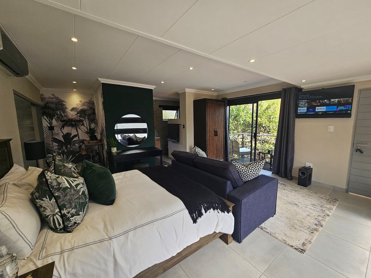 Vie à la campagne avec tous les équipements dont vous profiterez en ville. Un chalet de chaume sécurisé construit à partir de roche. Situé dans une ferme de 21 ha de brousse. Beaucoup d'oiseaux, des impalas, des blesboks et des girafes se promènent. 1 chambre avec lit Queen Size et salle de bain attenante. Séjour ouvert avec cuisine entièrement équipée, salle à manger et salon avec canapé-lit double queen size et Dstv. Véranda fraîche au milieu des arbres. Beau jardin en terrasse avec coin barbecue (boma). Parking couvert. Piscine récemment ajoutée.