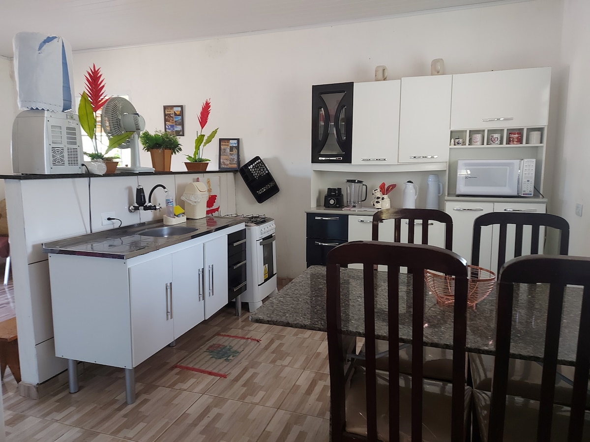 Sua casa no Catimbau com itens para o café da manhã :) A casa fica no caminho das principais trilhas do Catimbau, de frente ao ateliê de Luiz Benicio, perto de restaurantes e ha 10 minutos da Praça do Catimbau. Conta com 02 quartos, havendo neles: 01 cama de casal (quarto 01) e 02 beliches (quarto 02), cozinha completa, sala com sofá cama e banheiro com chuveiro elétrico. Tem como vista a Pedra do Cachorro, a Serra das Torres e, por trás da casa, a Pedra do Elefante.