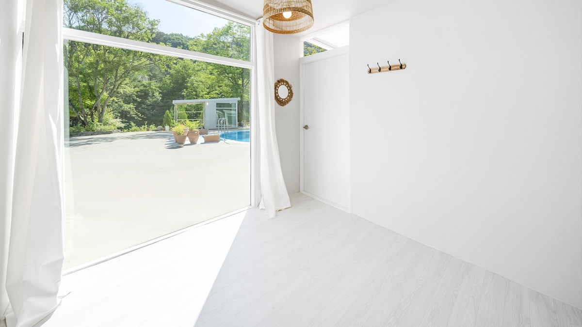 Veuillez lire les instructions et les règles d'utilisation de l'hébergement avant de réserver. « Une journée d'évasion de la routine quotidienne, un repos complet dans ma propre cachette… » 'Hoesun' signifie 'cachette tranquille'. Il s'agit d'un séjour privé respectueux de la nature situé dans un village rural isolé de Yangpyeong. La grande fenêtre du salon capture le magnifique paysage naturel comme une seule image. Il y a un grand canapé-salon devant la fenêtre où toute la famille peut s'asseoir, et un jacuzzi intérieur au centre du salon qui peut être apprécié toute l'année. Il y a un total de 2 chambres, chacune avec sa propre salle de bain et un lit king size. La piscine extérieure est exploitée avec de l'eau chaude ou tiède selon la saison. Vous pouvez laisser des souvenirs encore plus spéciaux avec des jeux aquatiques dans un espace privé. Juste à côté de la propriété coule un ruisseau peu profond. Vous pouvez également vivre une expérience écologique telle que la pêche au barbeau, à la tanche ou à la petite pêche. Séjour Hooeun vous offrira un repos tranquille loin de votre quotidien compliqué et ennuyeux.