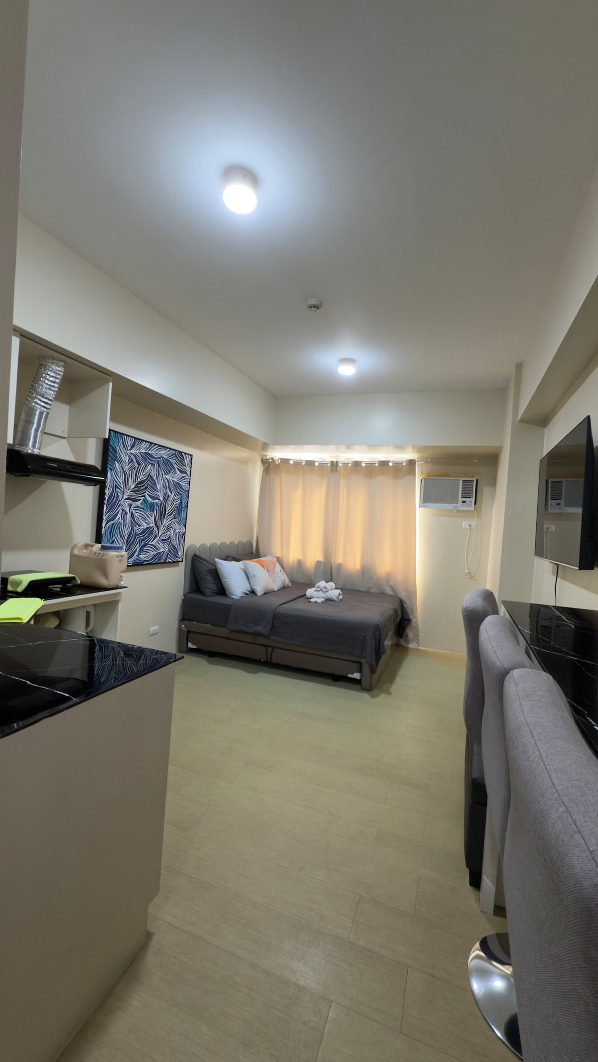 Accès à la piscine pour 2, à distance de marche de 4 grands centres commerciaux de la ville, Disney+ et Netflix, Internet haut débit parfait pour le travail et les loisirs, lumières à commande vocale, climatisation et télévision. Bienvenue dans votre studio minimaliste chaleureux et intelligent à MesaVerte Residences. Restez connecté avec une connexion Internet rapide pour le télétravail, détendez-vous avec des divertissements sans fin et profitez d'une retraite confortable à quelques pas de la vie nocturne, des restaurants et des boutiques.