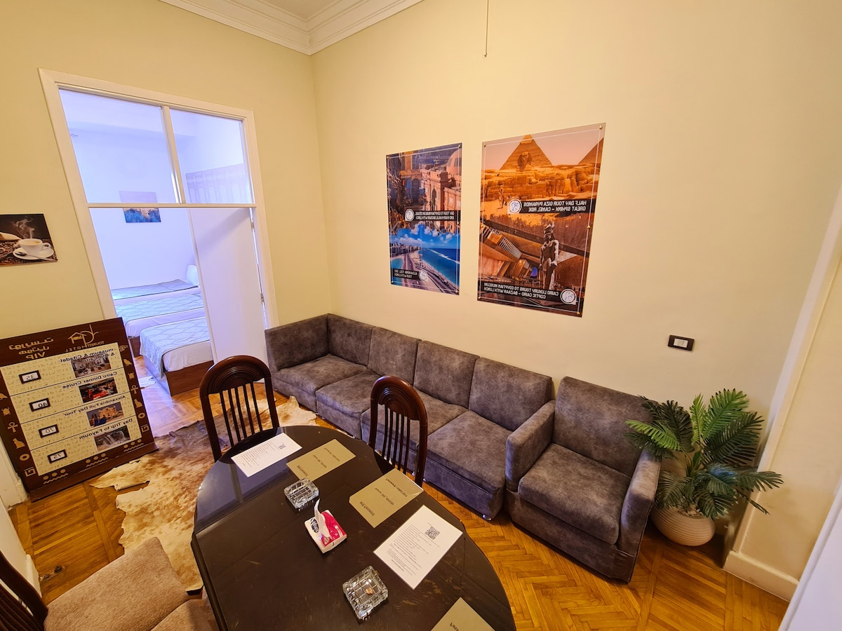 Welcome to our centrally located historic retreat nestled in the heart of Downtown Cairo.. where vintage stylish charm meets modern comfort. Step into the Egyptian Khedival era as you enter our family-friendly apartment, boasting high ceilings and glorious architectural details that evoke the grandeur of yester years..