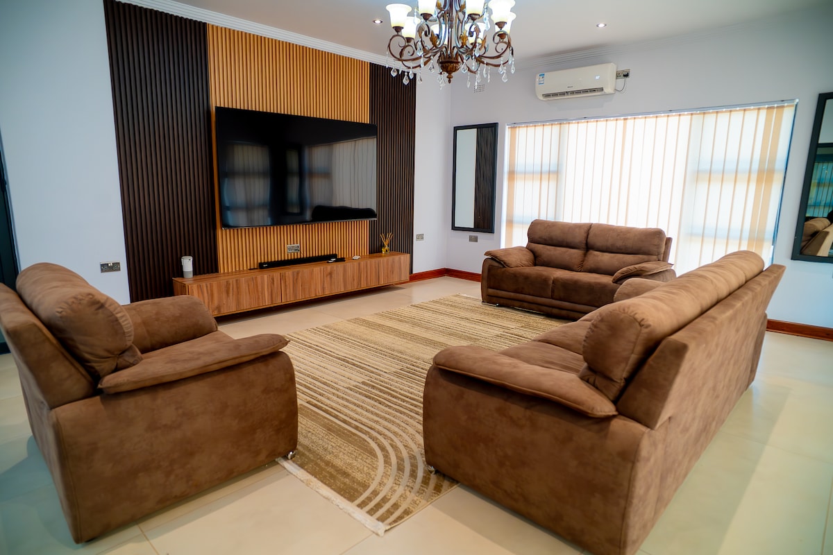 Cette spacieuse maison de 3 chambres offre une expérience de vie confortable et commode. Il dispose de 3 chambres confortables, 2 salles de bains et d'un espace de vie ouvert avec une télévision et une connexion Wi-Fi parfaite pour le divertissement. La cuisine est entièrement équipée avec un climatiseur électrique et à gaz. En outre, le lave-linge et le sèche-linge font de cette maison un choix idéal pour un séjour relaxant et sans tracas. Veuillez noter que la sauvegarde solaire est réservée au réfrigérateur, aux lumières, à la télévision et au Wi-Fi. Le climatiseur et la pompe Roots ne sont pas disponibles sur Solar.