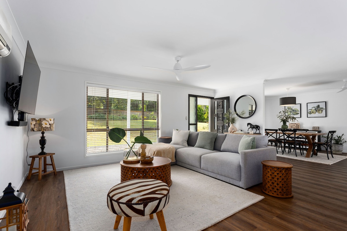 Une escapade parfaite à la campagne, votre propre ferme tranquille située sur 50 acres nichée sur une colline avec une vue imprenable sur les montagnes pittoresques de la région. À un peu plus d'une heure de Brisbane, vous pourrez vous détendre sur la terrasse en dégustant un verre de vin de l'un des vignobles voisins, assis autour de la cheminée ou en grillant des guimauves dans le foyer. La ferme se trouve à seulement 7 minutes en voiture du canton de Boonah et sur la même route et à seulement 3 minutes en voiture du vignoble et de la ferme de lavande de Kooroomba.