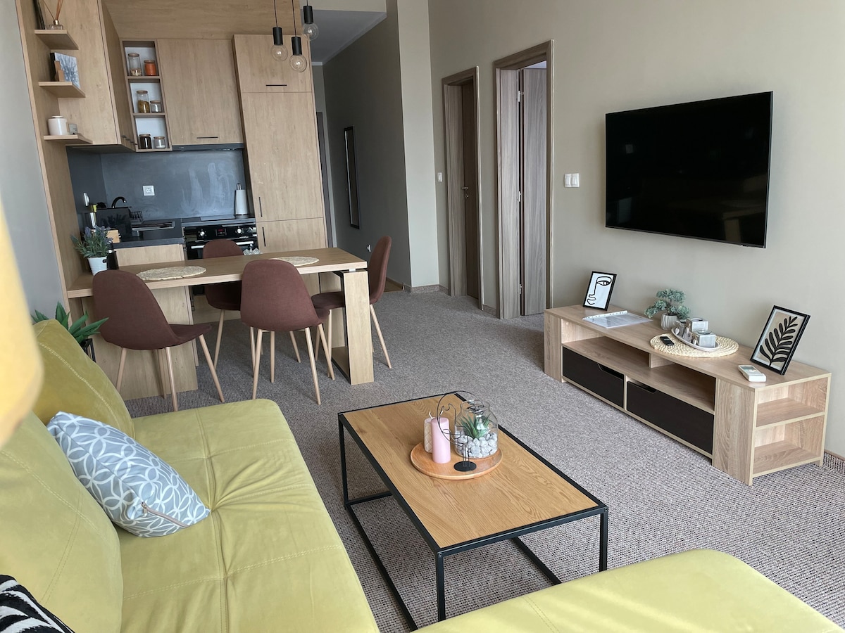 Bienvenue dans notre Sunny Haven à Burgas ! Cet appartement confortable et flambant neuf dispose d'une chambre, d'une salle commune combinant une cuisine et un salon, et d'une salle de bain moderne, il est parfait pour passer un séjour confortable. Pour simplifier les choses, un parking sécurisé est inclus. Profitez d'une retraite paisible dans un quartier agréable, à une courte distance des attractions de la ville.