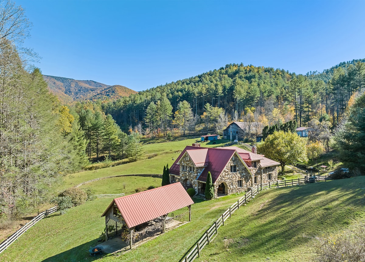 Réveillez-vous dans un grand lit king size de luxe et ouvrez la porte du garage pour profiter d'une vue imprenable sur les Smokies. Dégustez un café sur la terrasse. Lit et salle de bain entièrement meublés, climatisation/chauffage et kitchenette. Les animaux de compagnie sont autorisés 40 $ / premier animal de compagnie 20 $ / chaque animal supplémentaire. La zone est clôturée. Écoutez la rivière lorsqu'elle est allongée dans le hamac sur le pont. La scène idéale pour un après-midi reposant ou pour observer les étoiles de nuit. Observez la faune et les animaux de la ferme ou pêchez des truites dans notre 1/2 mile de rivière. Calme~ privé~ à couper le souffle~ accessible~