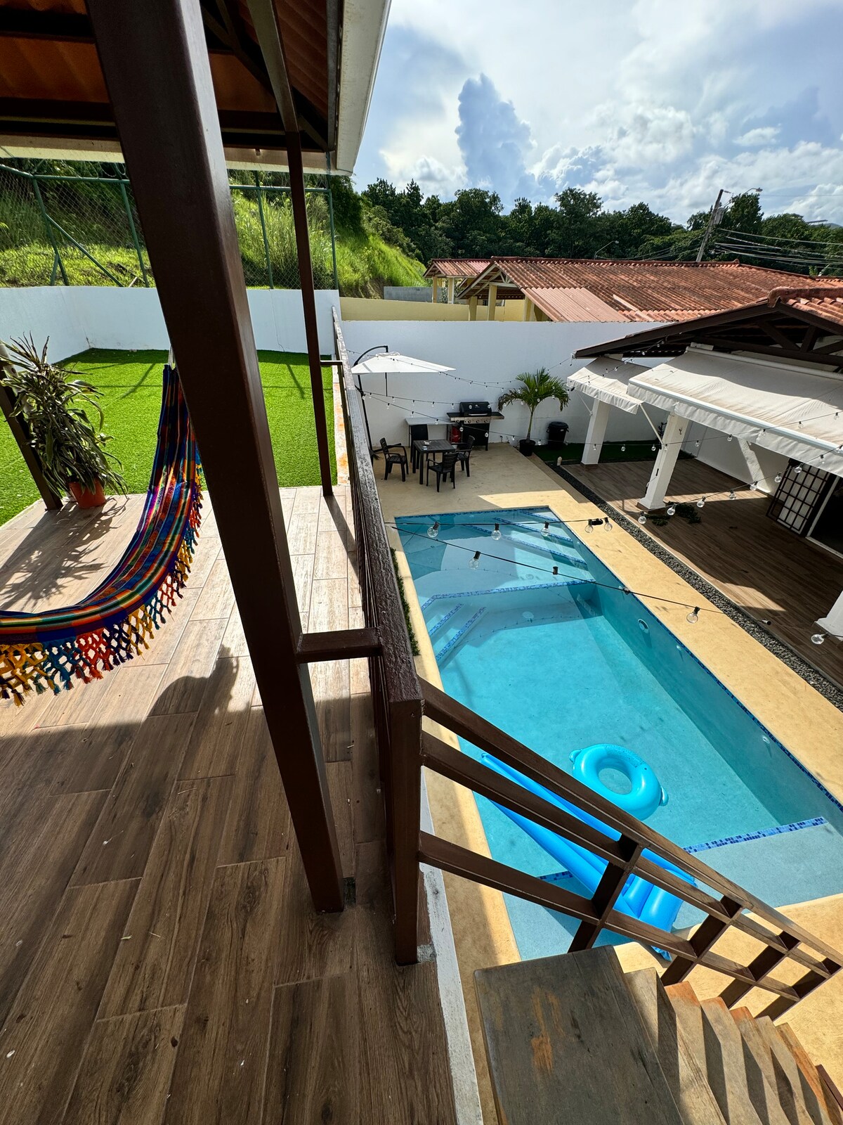 Idéal pour une famille ou des amis, ce logement calme avec piscine et terrasse en gazon synthétique, parfaite pour faire du sport, du yoga ou organiser des anniversaires, est situé dans un complexe résidentiel privé avec poste de sécurité à Arraiján, dans l’ouest du Panama, à 8 minutes de la plage de Vacamonte, à 3 minutes du centre commercial Westland Mall et de Costa Verde, et à 20 minutes de la ville en Uber ou Indriver pour seulement 10 $.