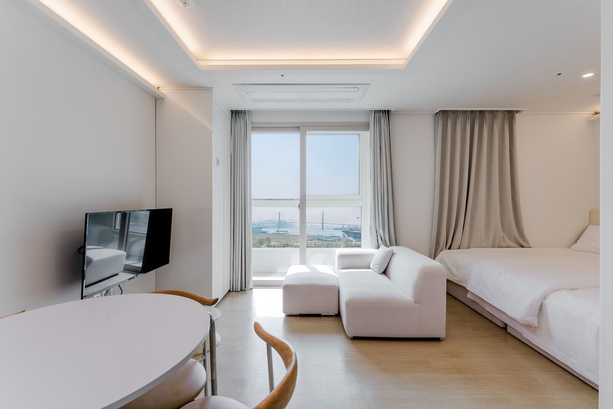C'est une maison nuage que vous pouvez atteindre et toucher🩵 Notre vie quotidienne nous tient toujours occupés et agités. Dans une destination, vous pouvez jeter votre apparence dans votre vie quotidienne. Je quitte toujours ma maison et mon temps de la même manière. Avec un cœur léger, dans une maison nuage propre et minimaliste Nous invitons nos voyageurs◡. ✔️ Vue imprenable sur l'océan en face du pont Gwangan/Situé à un étage élevé ✔️ Parking souterrain gratuit (pas de parking de tour) Plage ✔️ de Gwangalli à 3 minutes à pied / Milak le marché à 1 minute à pied / Waterfront Park, Millak Raw Fish Center à 5 minutes à pied ✔️ Standard 2 personnes/maximum 5 personnes (si le nombre standard de personnes est dépassé, des frais supplémentaires seront facturés par personne/veuillez vérifier le nombre exact de personnes et effectuer une réservation) ✔️ L'hôte gère directement le logement Cloud House est officiellement enregistrée en tant qu'auberge de ville touristique étrangère, et est enregistrée et exploitée en tant que société légale pour l'hébergement partagé domestique en vertu des dispositions spéciales de Mister Mansion.