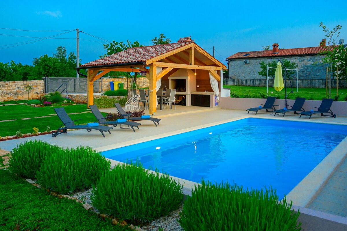 Villa élégante près de Rovinj avec piscine digne d'une photo, jacuzzi encastré, sauna. Réveillez-vous avec une vue panoramique sur la vallée. Pour les couples et les familles, à quelques kilomètres du parc d'aventure, du parc national de Brijuni, du parc des dinosaures, des villes médiévales et de la cuisine locale. C'est une véritable escapade verte pour tous ceux qui cherchent à revenir à la nature avec tout le confort de la vie moderne. Entièrement équipé pour cuisiner et se divertir dans 2600 m2 de jardin (football, ballon de vitesse, badminton et plaisir de la piscine) pour vos enfants et vos proches.