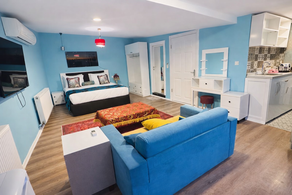 Binamızın -1 ve -2 katlarında yer alan suitimiz, şık tasarımı ile konforlu bir konaklama deneyimi sunmaktadır. Odada Netflix erişimli televizyon, mutfak ve yatak ile oturma alanını ayıran zarif bir separasyon bulunmaktadır. Dönerli televizyon, her açıdan rahatça izlenebilir. Binamız merkezi konumda, metro istasyonuna yakın olup, ulaşım araçlarına yürüme mesafesindedir. Odada havalandırma amacıyla küçük bir pencere bulunmaktadır.