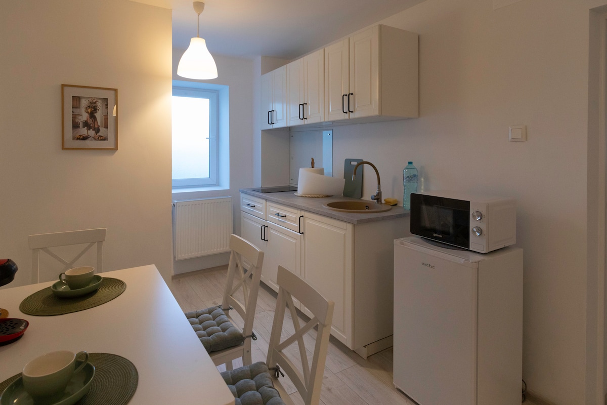 Bienvenue dans notre studio chic, situé près du centre de Buzău ! L'espace dispose d'une chambre confortable séparée du salon par une cloison vitrée. Le salon comprend un canapé compact et la cuisine est équipée d'un grand réfrigérateur. La salle de bain dispose d'une douche, et il y a une sortie privée vers le jardin. Le stationnement dans la rue est disponible juste devant la villa. Parfait pour des séjours courts ou longs, offrant confort, style et un excellent emplacement central !