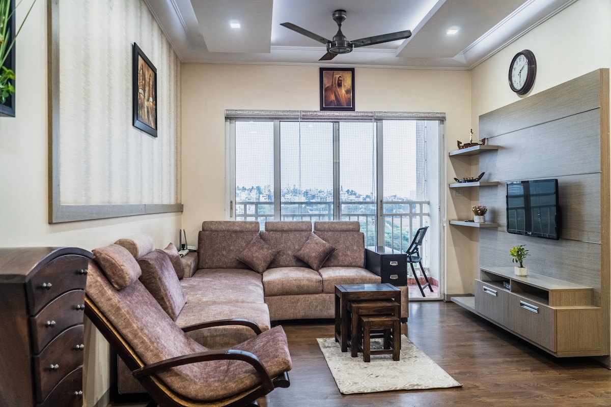 Découvrez un luxe exquis dans notre penthouse au nord de Bangalore, idéalement situé près de Manyata Tech Park, de Bhartiya City, de Sobha City et de diverses ZES. Avec Hebbal Ring Road à seulement 5-6 km et l'aéroport BLR accessible à moins de 30 minutes en voiture, notre penthouse offre commodité et élégance. Profitez d'une vue imprenable, de toutes les commodités modernes et de la culture urbaine animée à votre porte. Votre séjour parfait à Bangalore commence ici Pour votre divertissement, l'abonnement Netflix et Amazon est inclus.