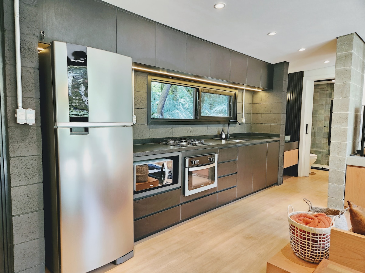 Reconnectez-vous à la nature dans cet endroit inoubliable Ici, vous apprécierez le confort d'un module conçu et construit pour une expérience unique, une intégration avec le paysage et beaucoup de tranquillité. Nous garantissons confort et bonne ambiance pour votre repos Conçu pour accueillir un couple, il dispose d'un lit queen size, d'eau chaude au gaz dans la salle de bain et la cuisine, smartv 32', internet fibre, cuisine complète, espace extérieur avec terrasse, barbecue, feu de camp, hamacs et chaises à bascule
