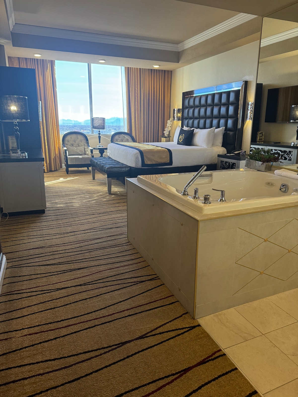 Suite studio élégante dans le complexe hôtelier Hip AAA 5 Diamond Palms Hotel & Condo avec balcon et vue imprenable sur le Strip. Parquet luxueux en marbre et bois. Meubles et décoration ultra modernes et cuisine entièrement équipée avec appareils ultramodernes. Cuisinière et réfrigérateur/machine à glaçons. Profitez d'une connexion Wi-Fi gratuite et de deux téléviseurs de 42pouces avec chaînes haut de gamme. 1 lit King Size et un grand canapé-lit qui se transforme en lit Queen Size. La salle de bain est tout en marbre avec grand jacuzzi et douche