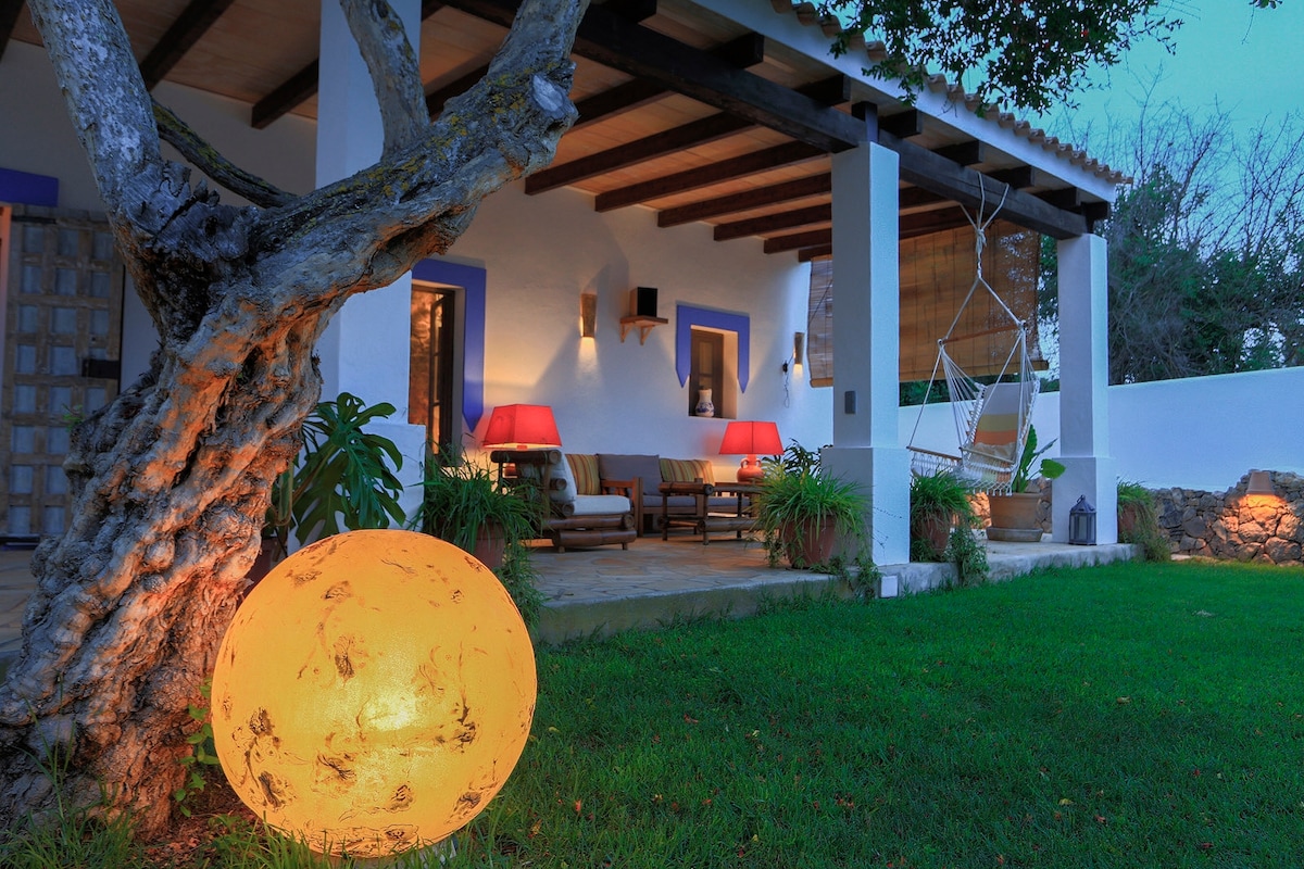 Charmante villa de charme nichée dans un jardin verdoyant romantique avec de vieux arbres et des fleurs. Avec ses terrasses, ses espaces de détente et une belle petite piscine privée, la propriété offre beaucoup d'espace et d'intimité pour 8 à 9 personnes. Les 4 chambres sont climatisées. Internet : fibre optique haut débit ! En 6 minutes à pied, vous rejoignez la belle plage de sable de Cala Llonga. Restaurants, supermarchés, magasins et station de taxis sont à seulement 4 min à pied. Le golf d'Ibiza ou Santa Eularia sont à 5 minutes en voiture ; la ville d'Ibiza est à 12 minutes.