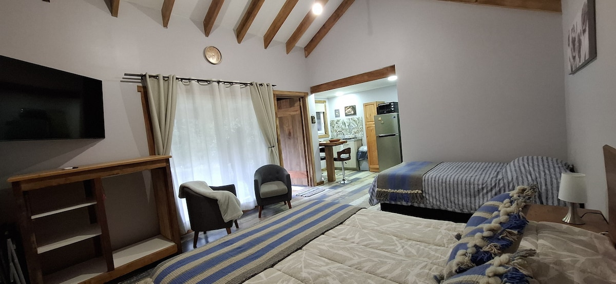 Détendez-vous dans cet espace calme et élégant. Insérée dans une forêt indigène de la région des rivières, soigneusement construite dans la forêt pour que vous soyez inondé par l'énergie naturelle de l'environnement, elle est également située à proximité des thermes de Vergara à 4 km, des thermes géométriques à 9 km, des thermes de Rincon à 11 km, de la plage de Coñaripe à 9 km, du parc national de Villarrica à 14 km et de nombreux autres endroits d'une grande valeur naturelle. Plus d'informations sur #tierradevolcaneschile