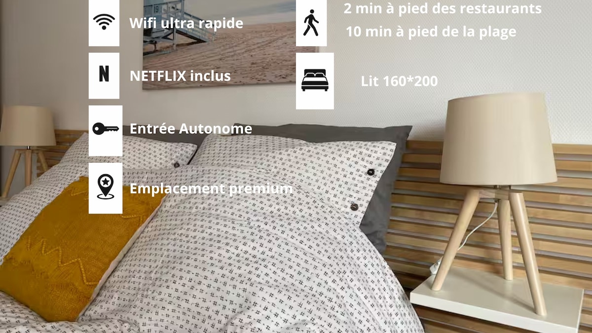 45 m2 à l'ambiance Nature et Bohème. Situé à Etaples-sur-mer à 5 km du Touquet-Paris-plage, votre gîte de 45 m² à la décoration soignée, équipé d'un espace balnéo, sauna privatif et table de massage Services TV complet avec Canal+, Netflix, Disney+ et Amazon Prime... Petit déjeuner offert A quelques minutes des plages de la Côte d'Opale. En amoureux ou entre ami(e)(s) réservez votre séjour et profitez de nos équipements et de notre belle région. Le gîte est non fumeur, animaux non admis.