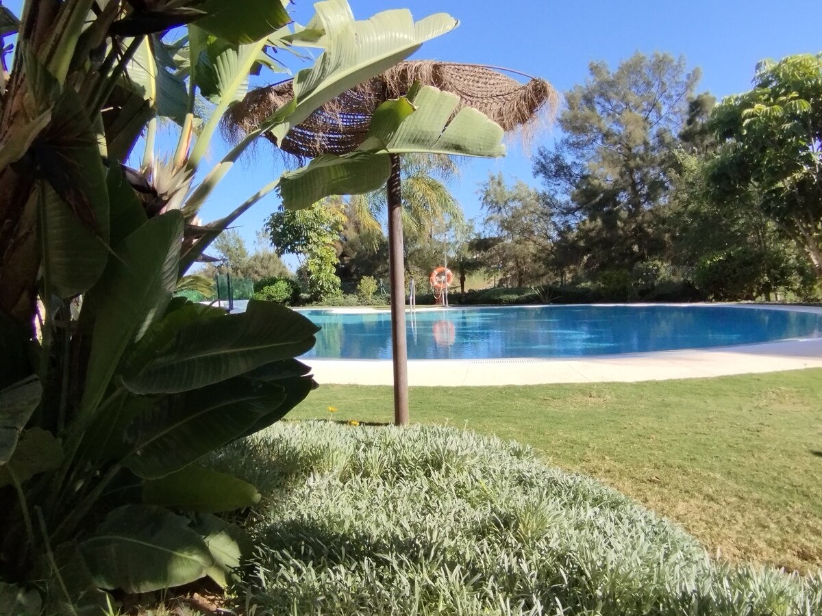 Entièrement rénové et idéal pour un séjour agréable. Deux chambres avec choix de matelas moelleux ou ferme, 2 salles de bains (une entièrement neuve), 3 téléviseurs intelligents (y compris les chaînes du monde), WiFi rapide et climatisation dans chaque espace. Cuisine moderne avec four, micro-ondes et plaque de cuisson. Grand balcon avec intimité totale et vue dégagée sur le golf et la mer. Il y a aussi un patio. Vous pourrez donc choisir entre le soleil ou l'ombre. Parking privé. Beau jardin avec grande et petite piscine.