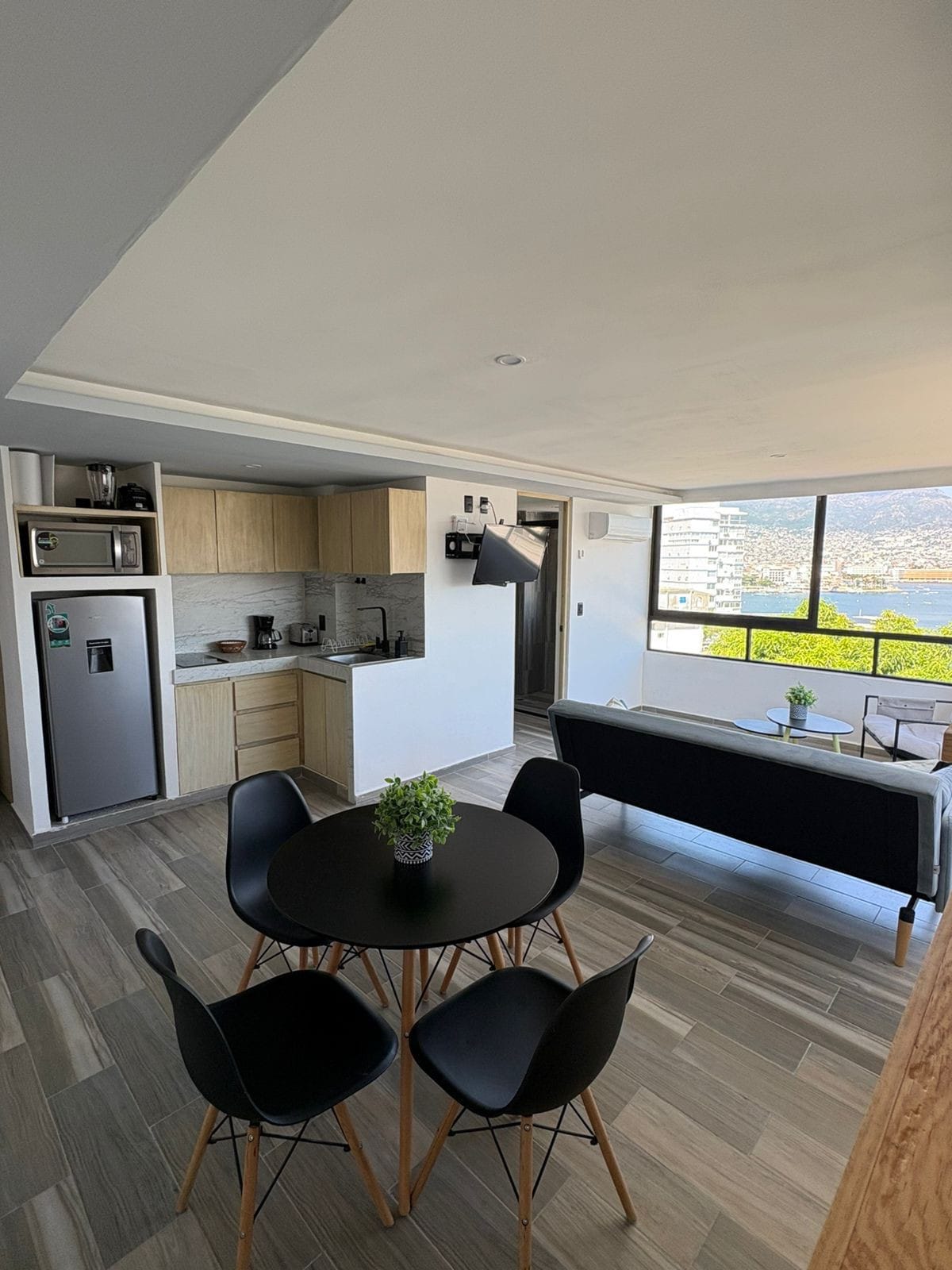 El depto (50m2) es parte de un condominio mediano, en el Fracc. Las Playas. A 5 minutos en coche del Club de Yates y de la Playa de Caleta. Con vista panorámica; tranquilo y seguro. Tiene 1 habitacion con una Kingsize y en la sala con una cama individual y dos colchonetas. Tenemos cocina y comedor. La terraza y la alberca son de área común. Notas: 1. No tenemos aire acondicionado, pero ventiladores sí 2. Antes de reservar revisa muy bien si la ubicación es idónea para ti.