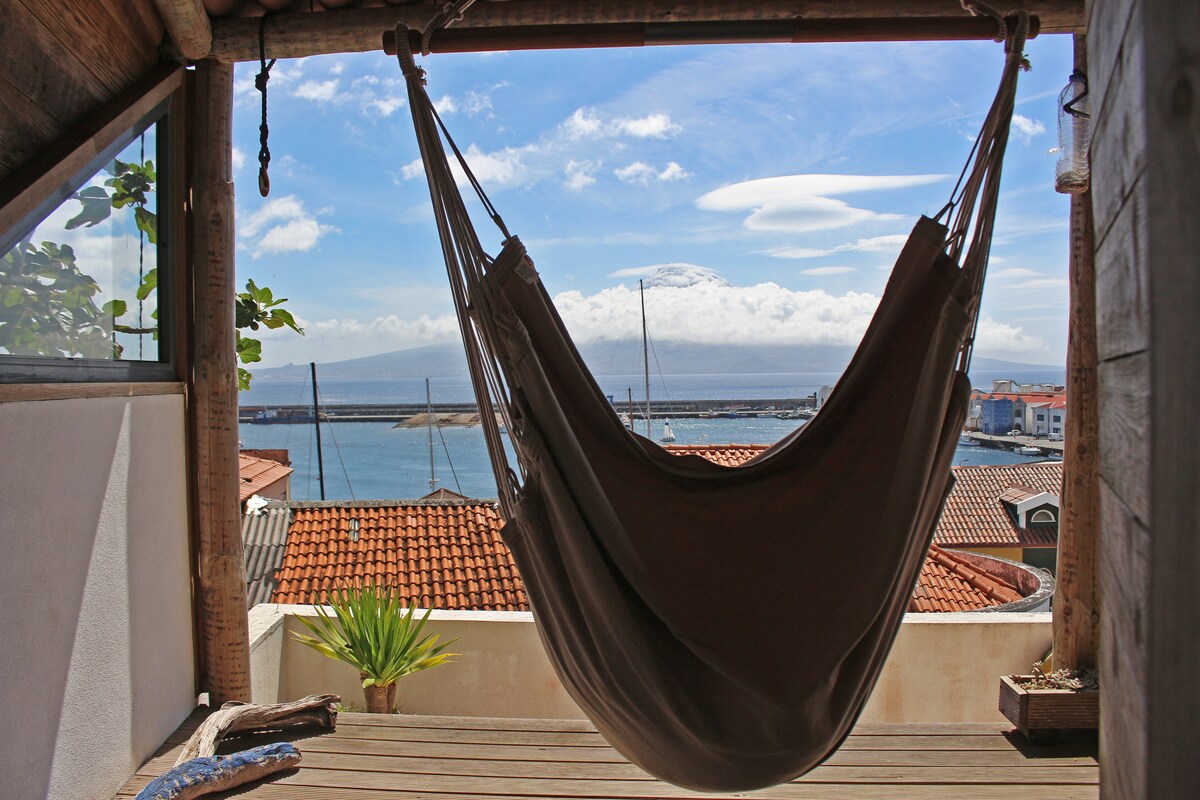 Casinha em frente à praia de Porto Pim, com uma vista incrível e bem equipada. A 5 min. a pé do centro da cidade Tem TV cabo e Wi-Fi. Estacionamento gratuito perto de casa e espaço para guardar as suas bicicletas dentro de casa. Situa-se num antigo bairro de pescadores de frente para a baía e praia de Porto Pim e para o Forte de São Sebastião, muito agradável, tradicional e muito muito calmo.