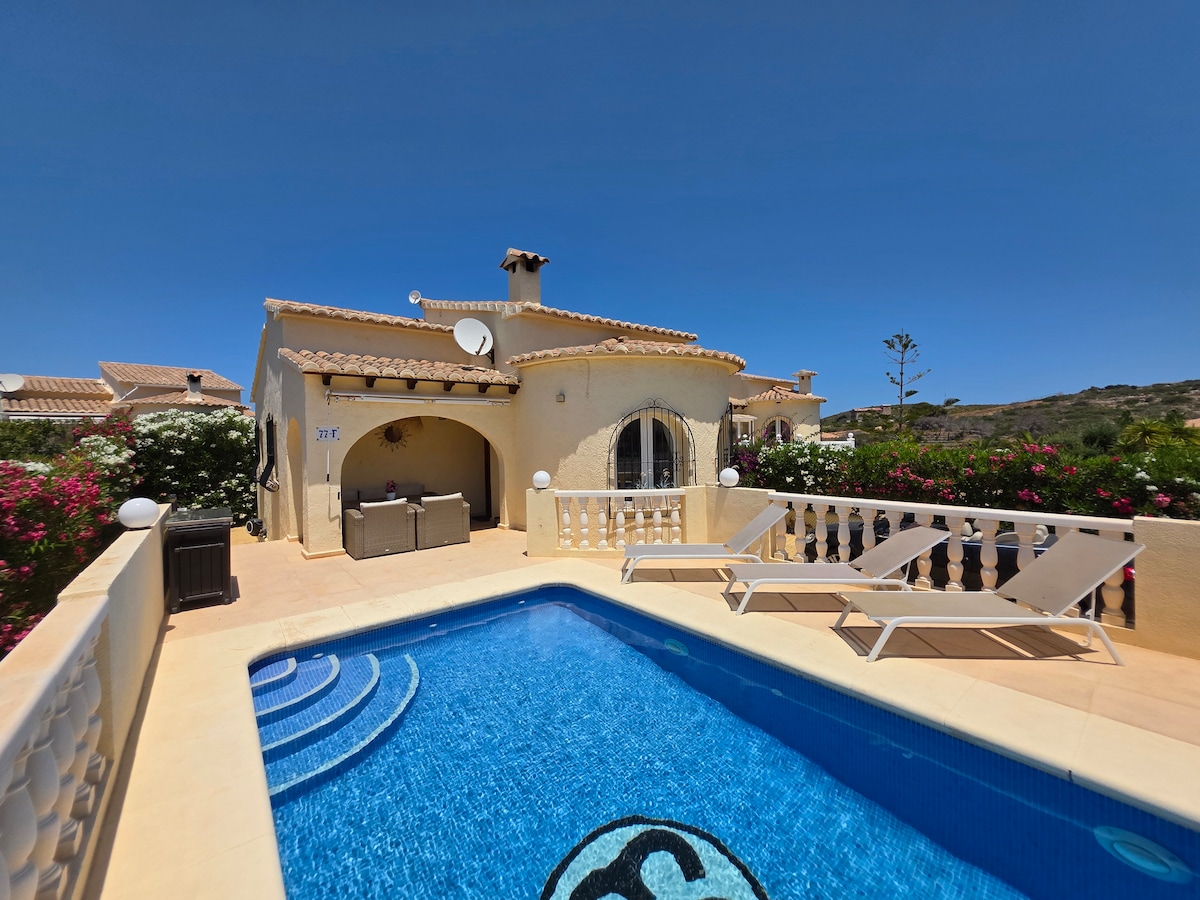 Villa neuve et design (indépendante avec terrasses et piscine privée chauffée) dans un condo avec piscine, garage, aire de jeux pour enfants et à côté de la plage. Cuisine entièrement équipée. (220 mètres sur 3 niveaux) Vue imprenable sur la mer et les montagnes. Chalet indépendant avec parcelle et piscine privée chauffée, dans une urbanisation avec piscine commune, avec accès direct à la rue de la plage. Très spacieuse, avec garage. Quartier très calme. En face de la crique de pierre et à 300 m de la plage de sable