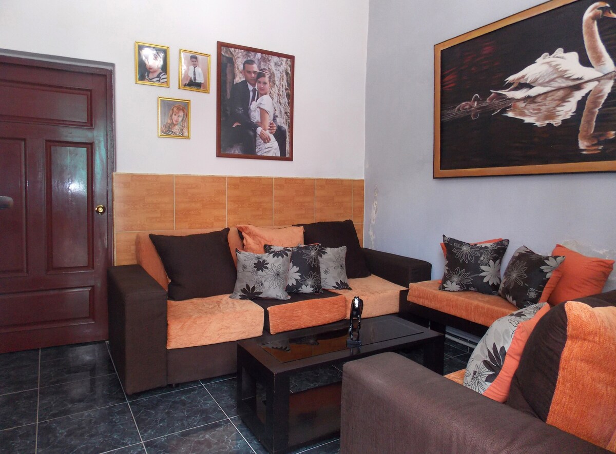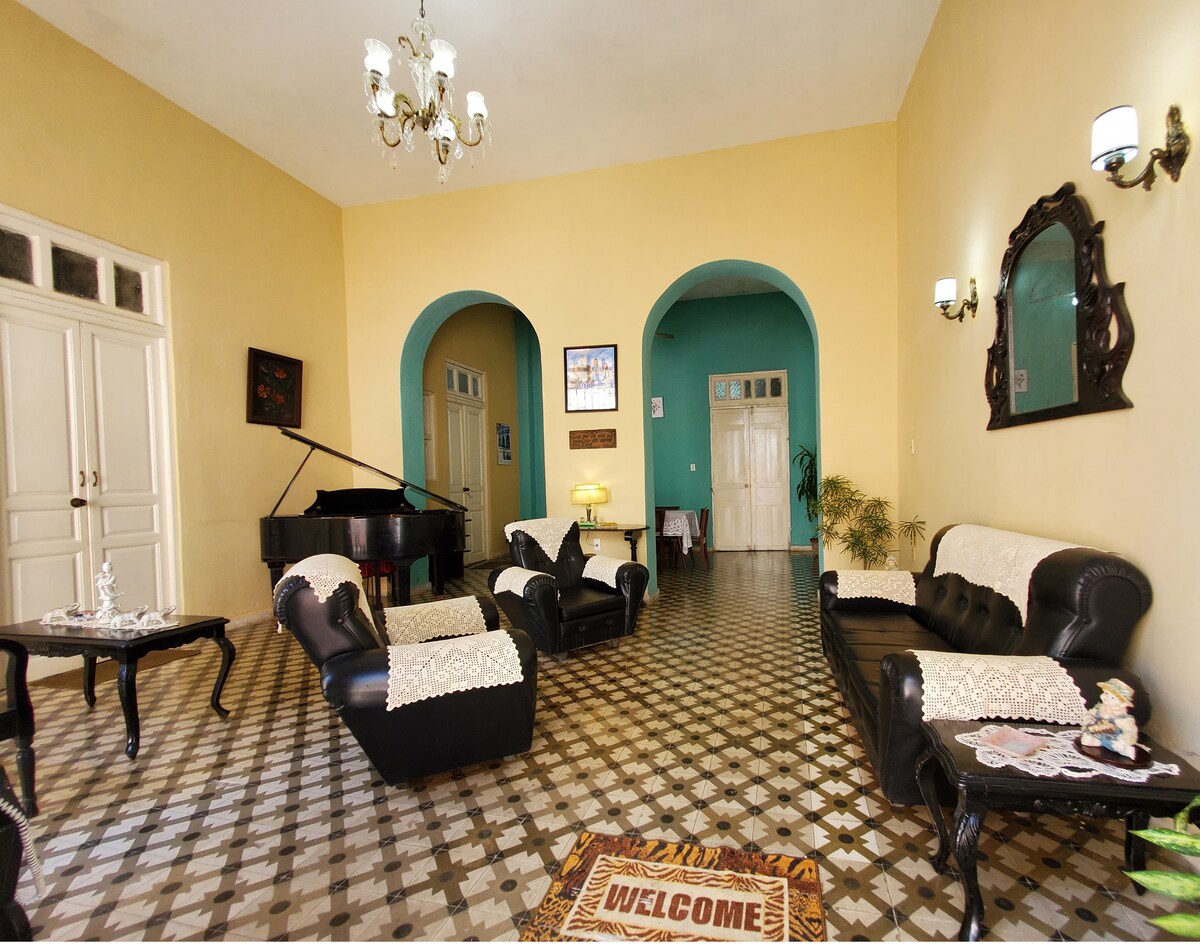 Maison moderne de deux étages située dans le centre-ville historique de la ville de Camaguey, à quelques pâtés de maisons de la rue commerciale principale. Le niveau principal est entièrement disponible pour le voyageur et comprend un salon, une salle à manger, une cuisine entièrement équipée (cuisinière à gaz, micro-ondes, réfrigérateur) et la chambre principale (TV, climatisation, climatisation, coffre-fort) avec salle de bain privée (eau chaude et eau froide). Une grande terrasse est située à l'étage, l'endroit préféré pour se détendre et profiter d'un coucher de soleil dans l'une des plus belles villes coloniales de Cuba.